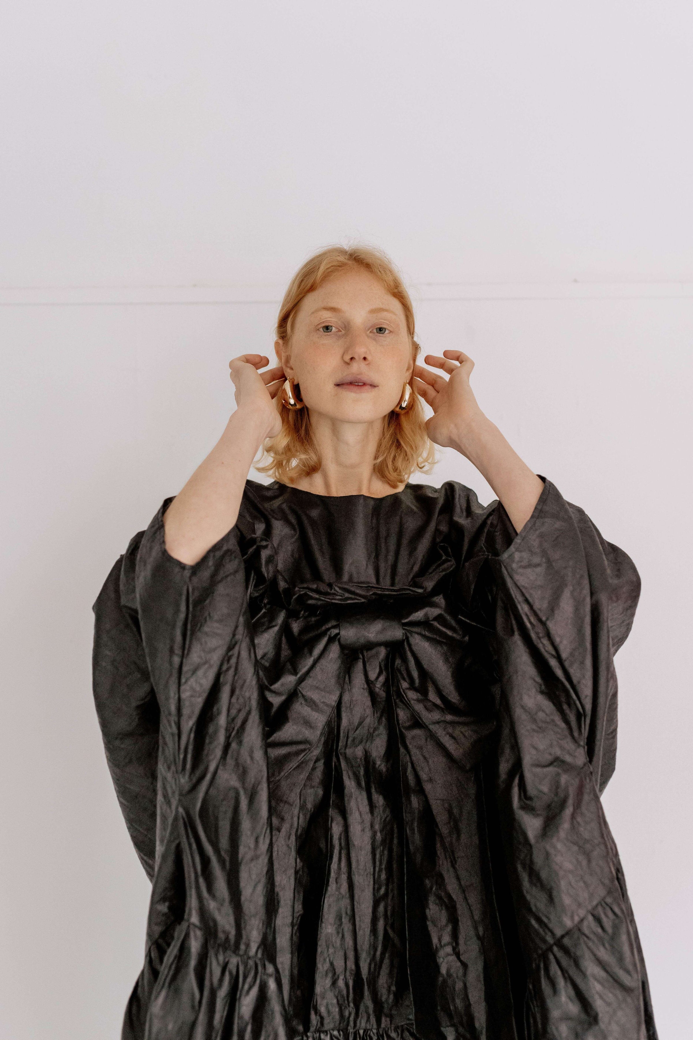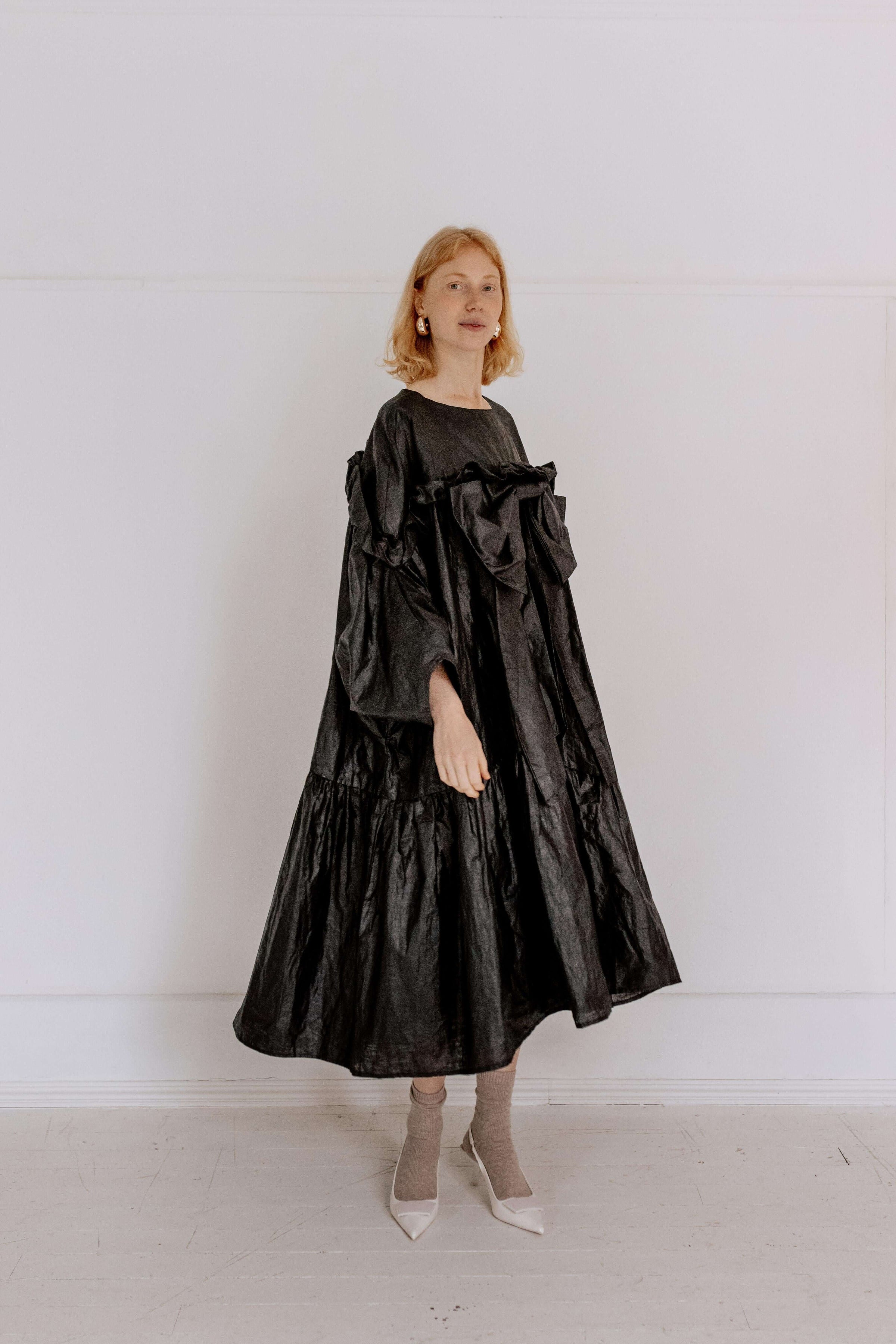 BOW DRESS | BLACK BEETLED | Our one stop, maximum impact party season dress. Based on the silhouette of our Leila dress, we have added length for a more dramatic shape. The black beetled linen gives a unique sheen that gives this dress such a fun edge. An