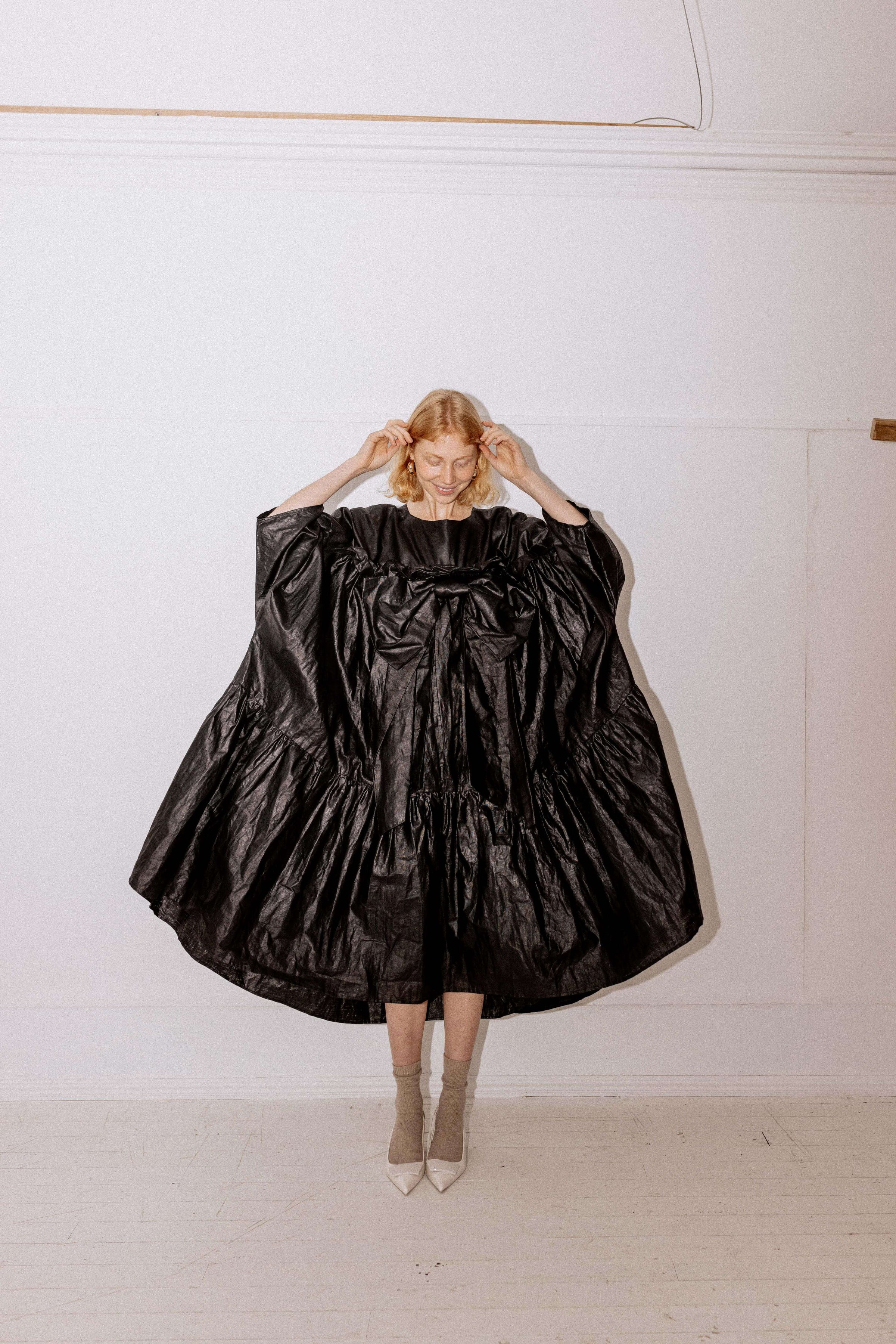 Based on the silhouette of our Leila dress, we have added length for a more dramatic shape. The black beetled linen gives a unique sheen that gives this dress such a fun edge.