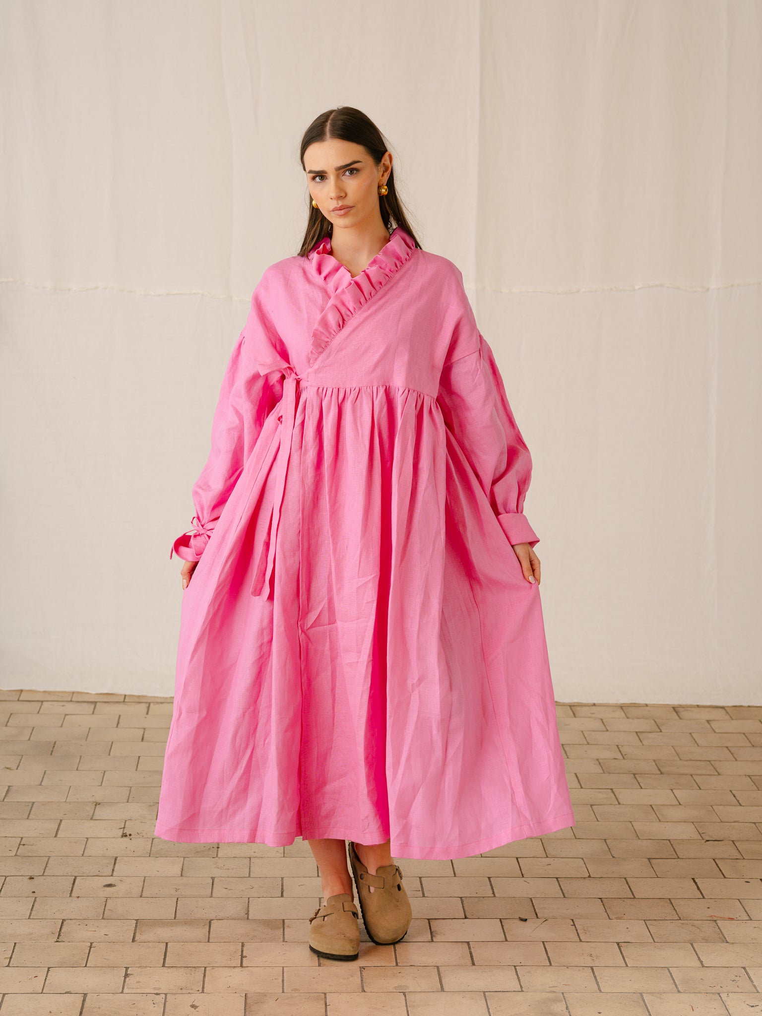 Camille can be worn three ways. Tie to the front or back, or wear open over jeans and a tee as a light summer coat- she’s up for coming with you anywhere and everywhere - party won’t start til she walks in!