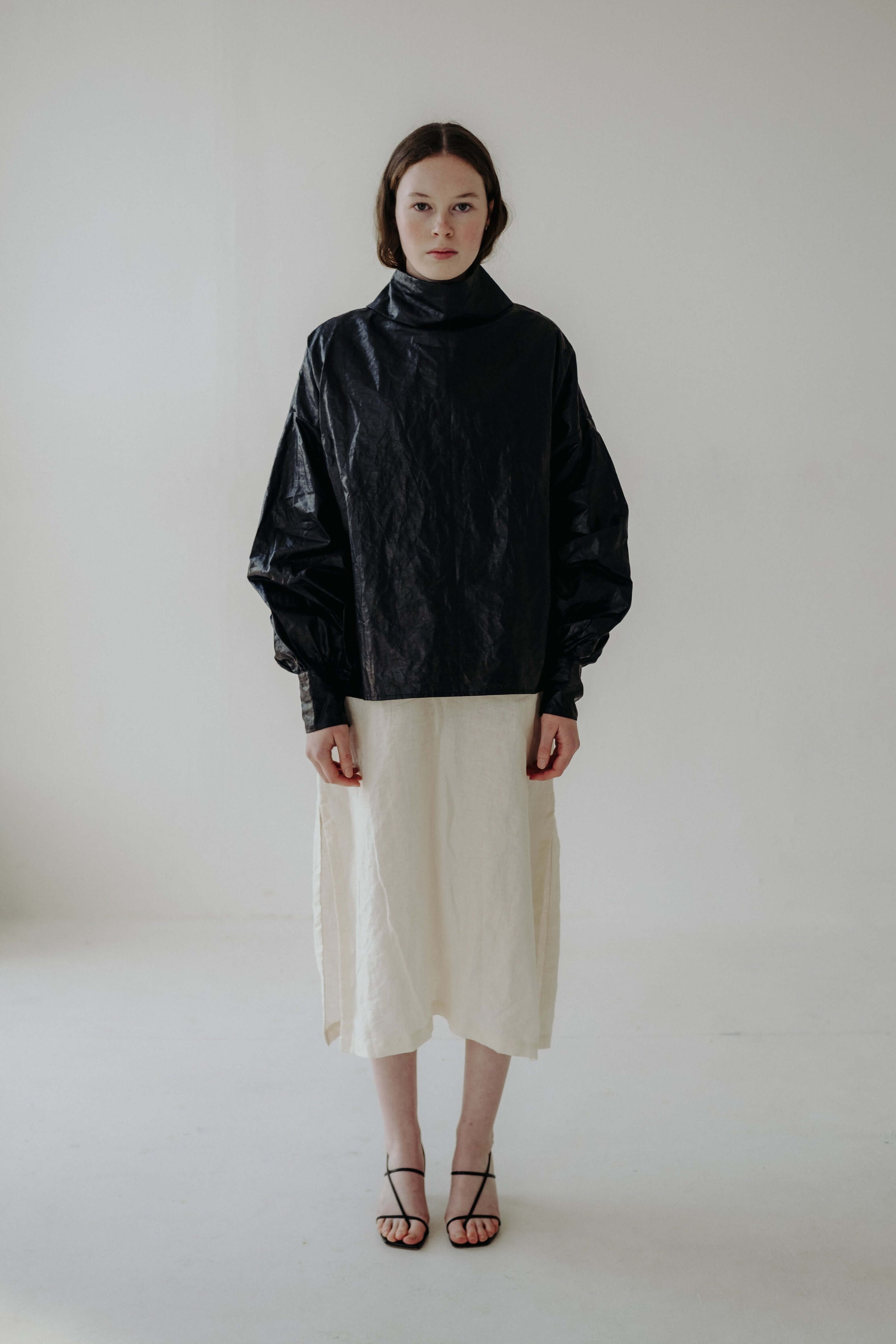Cadhla’s reversible design makes her endlessly versatile. Wear her buttoned to the front for a classic shirt look, or turn her around for a clean, elevated silhouette that transitions beautifully into evening. The beetled linen lends an architectural quality, holding its shape while softening beautifully over time. The linen also has a light sheen, adding an almost leather like quality to the shirt.