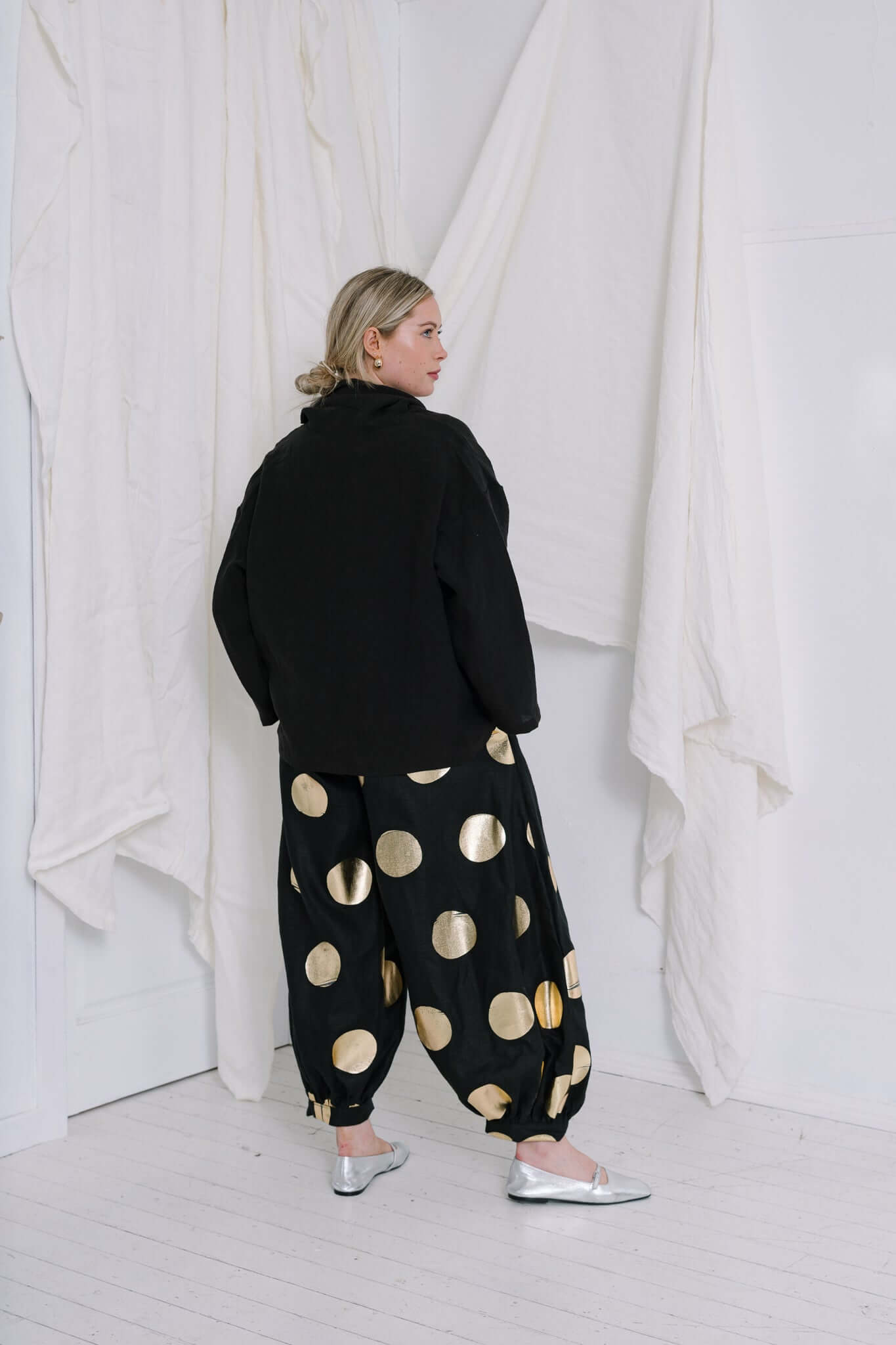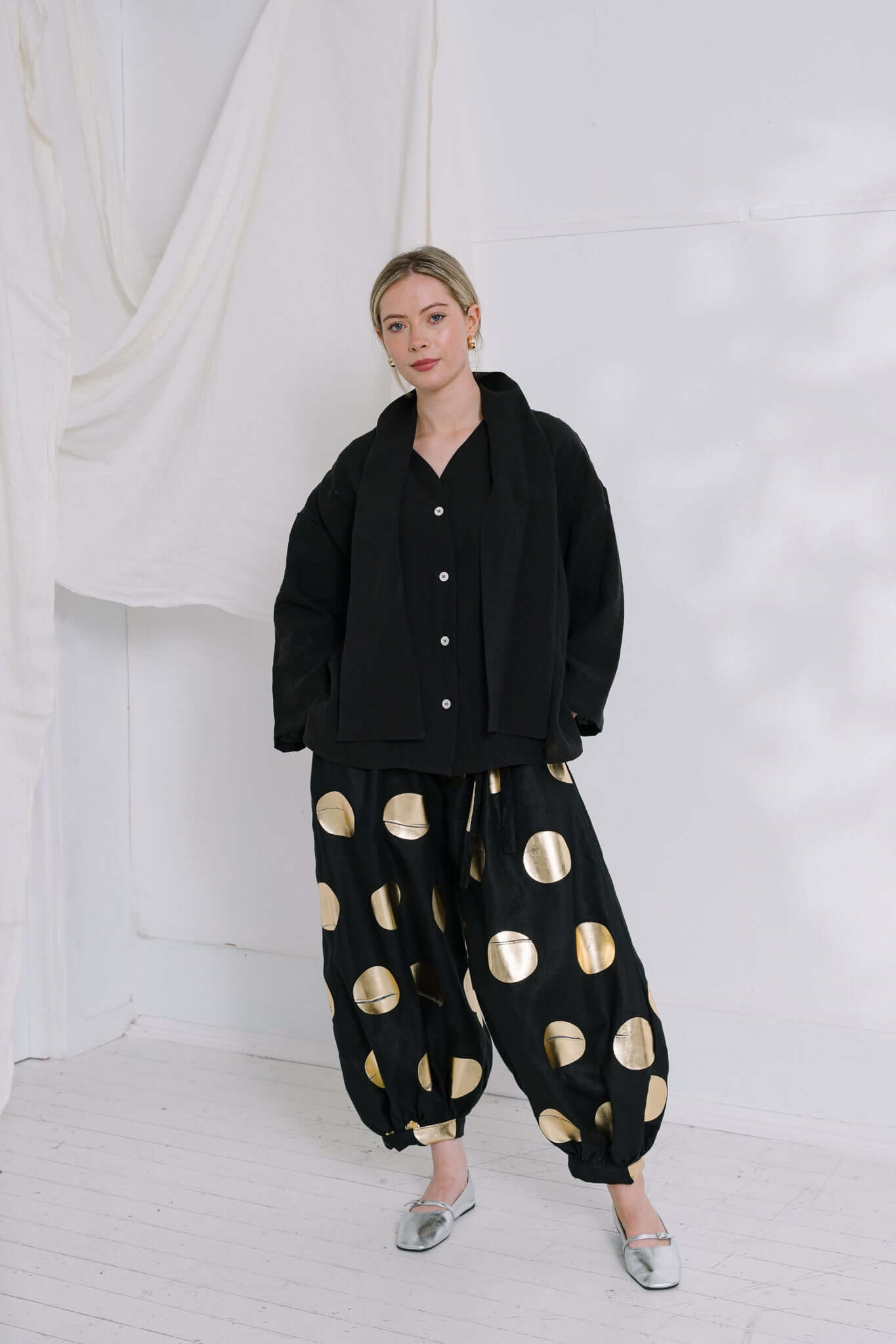 The oversized collar, secured with a tie at the back, brings sculptural interest and can be styled loose, tied or draped. True to Freya’s versatile spirit, she can be worn buttoned to the front, reversed for a clean silhouette, or layered open as a jacket. In tumbled black, she is timeless, adaptable, and effortlessly chic.