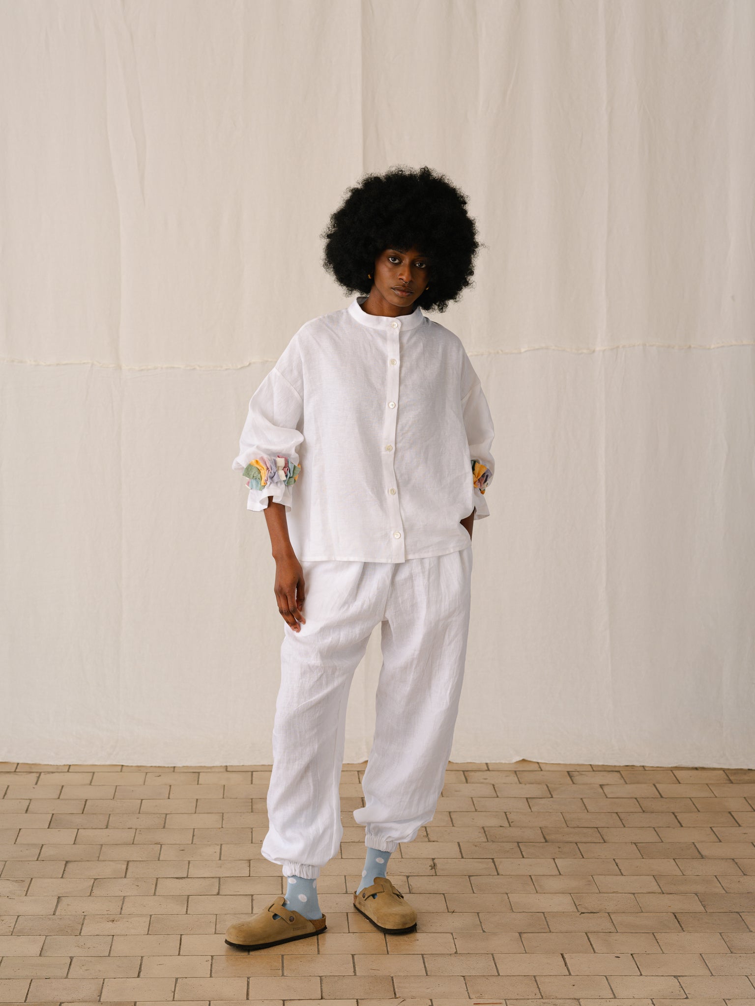 Details include a classic grandad collar, elasticated cuffs and natural shell buttons. Created with a soft tumbled crisp white linen.