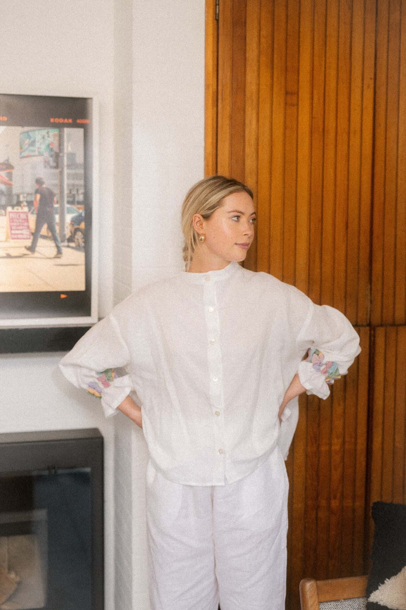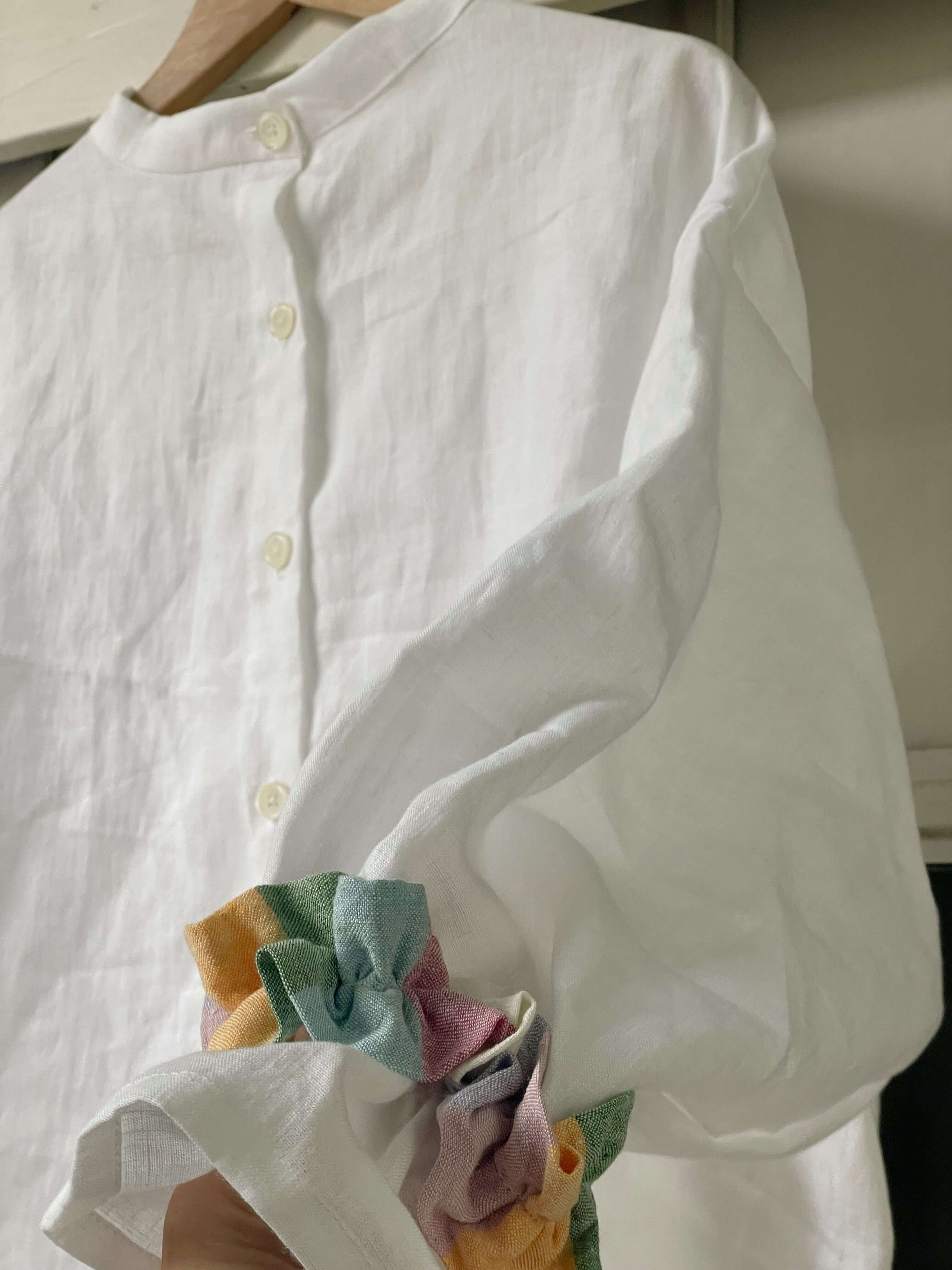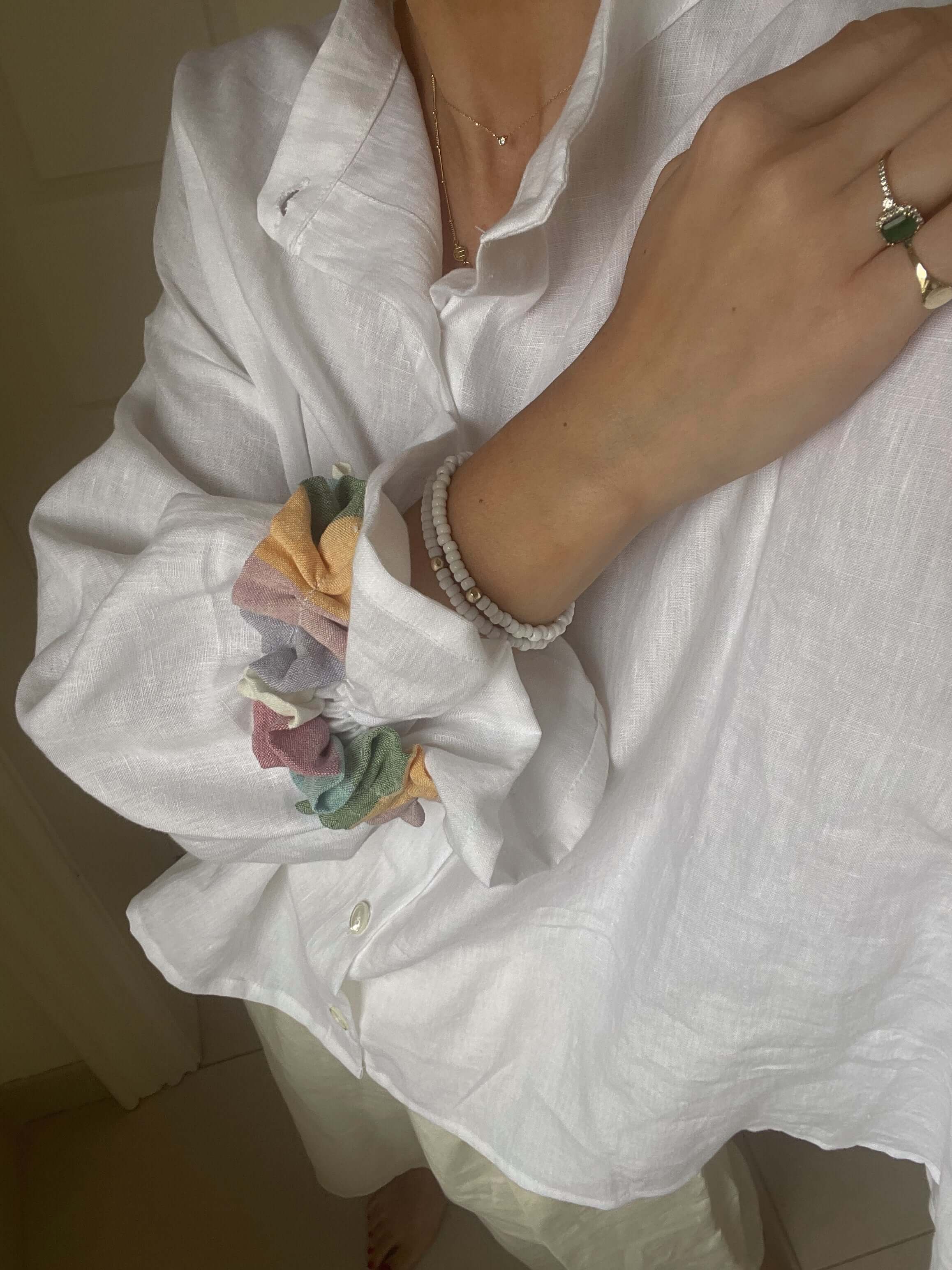 A twist on the classic white shirt, we have added a little ‘happy’ magic to the sleeves in our signature striped linen, adding a subtle yet playful colour pop.