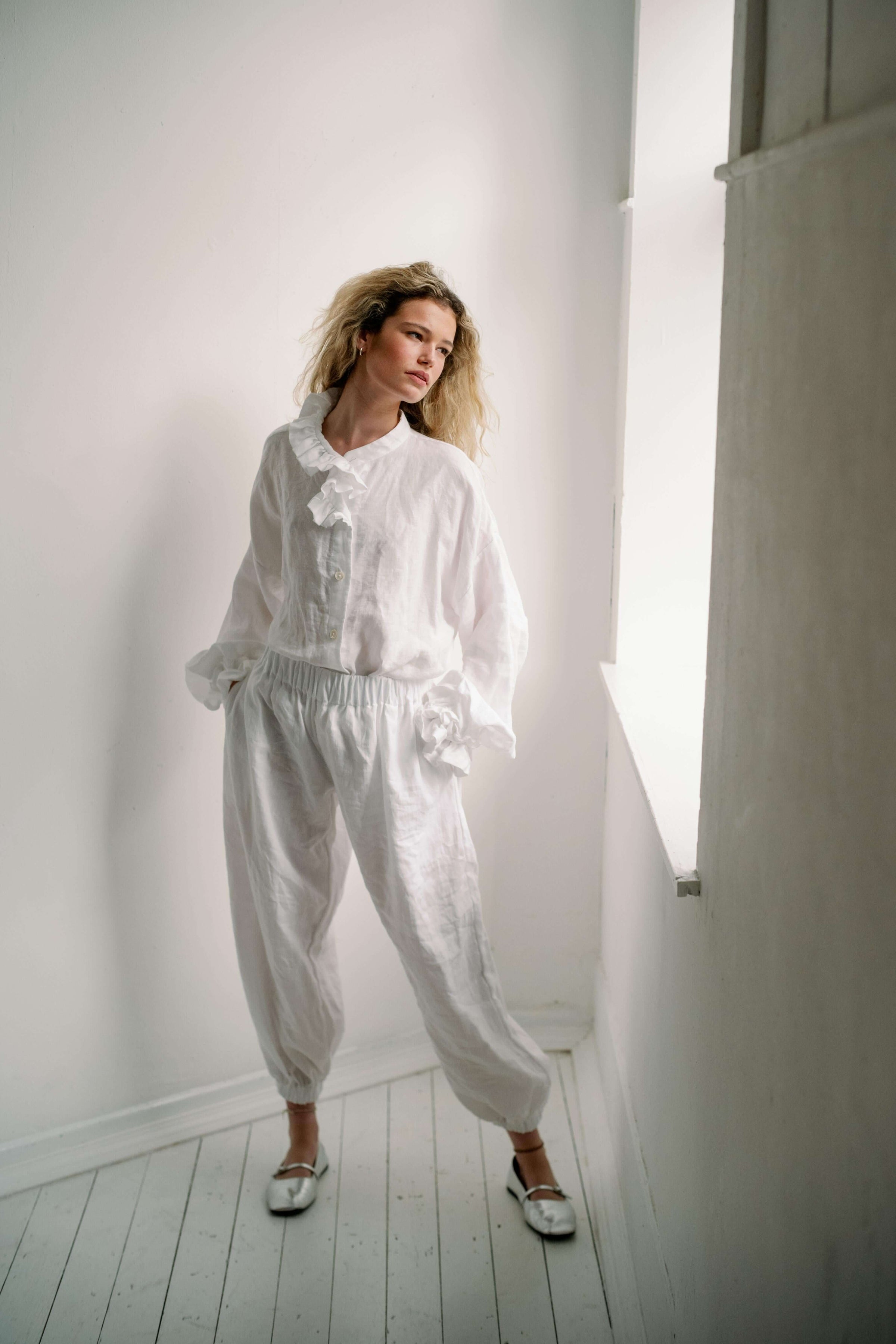 A fresh take on our signature Marshmallow Blouse — now in a crisp, luxurious white linen. This version offers a playful reimagining of the classic white shirt, blending timelessness with a modern Kindred twist.