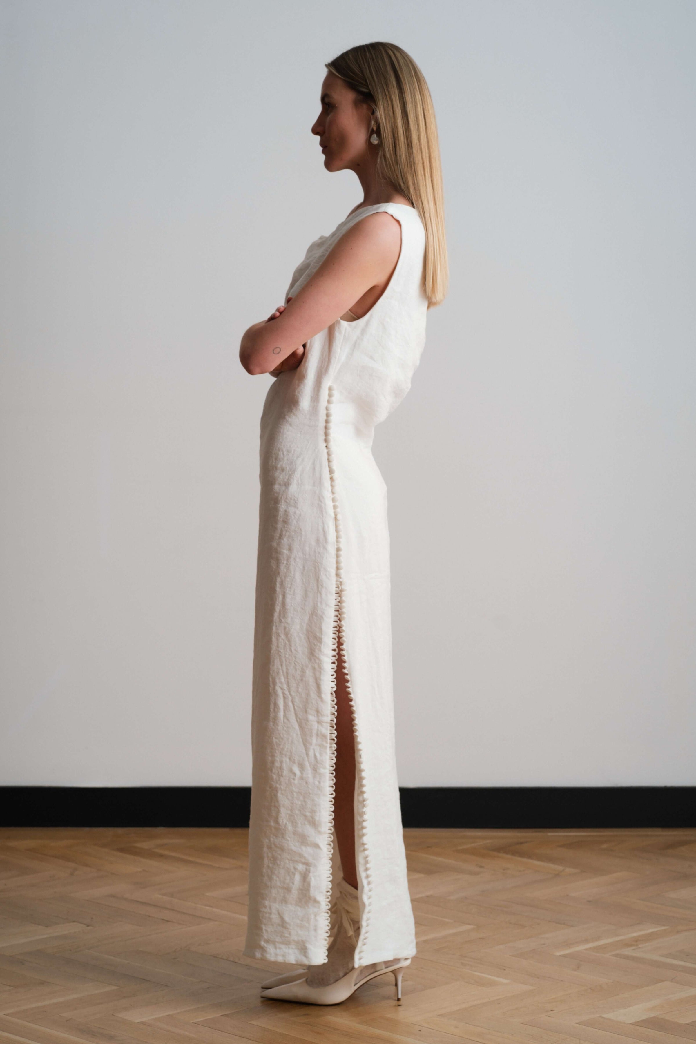 Crafted from beautifully textured ivory linen, the Hinneh Dress offers a balance of comfort and sophistication that feels both fresh and chic.