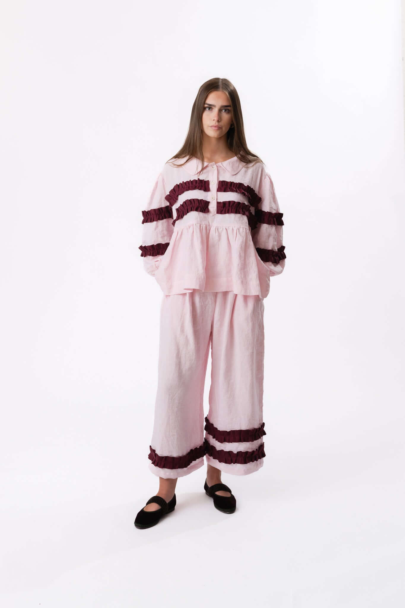 Draw back the curtain and step into a softer world — the Curtain Call Trousers are where ease meets quiet drama. Cut in soft tumbled pink Irish linen, they bring a sense of play to every day, with a flowing wide leg that moves beautifully and merlot ruffle hems that feel both regal and whimsical.