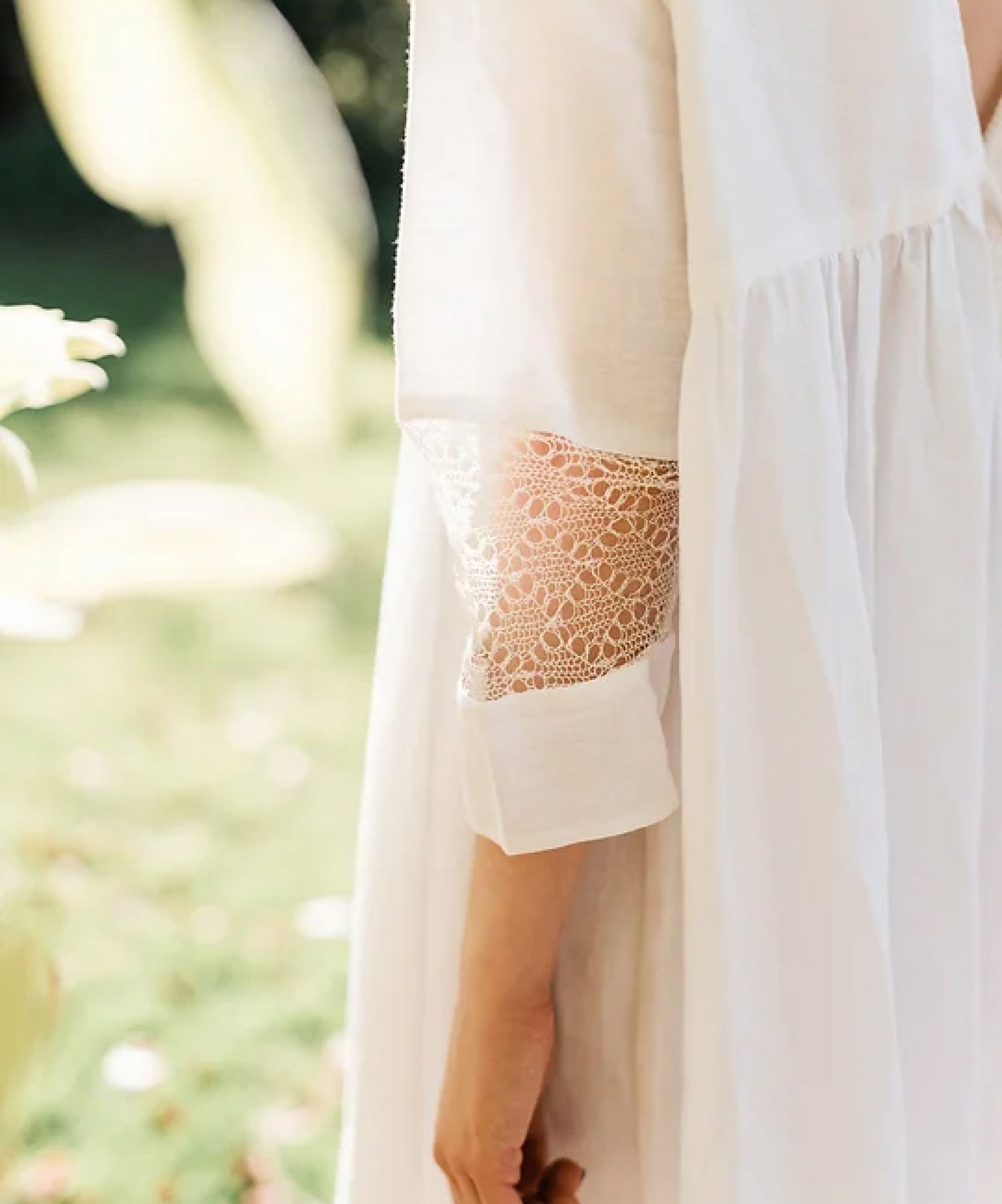 Our pledge to keep things local doesn't end with sourcing. Every piece is thoughtfully brought to life in Ireland by our local seamstresses and Irish crochet artisans. In an age of automated mass production, we are choosing to invest in and champion human skills, and by doing so, we are playing a role in preserving a valuable cultural heritage.Local production not only furthers the reduction of our carbon footprint, but it also allows us to support and uplift the local economy by providing jobs and continuing the lineage of traditional Irish craftsmanship. This embodies our belief in sustainability as a holistic concept—it's about the environment, the people, the skills, and the community.