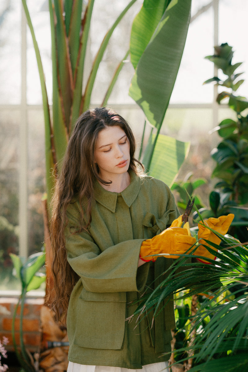 The floral print captures something delicate and fleeting, while the Gardener’s Smock Set, structured outerwear and special beetled linen pieces bring depth and character.