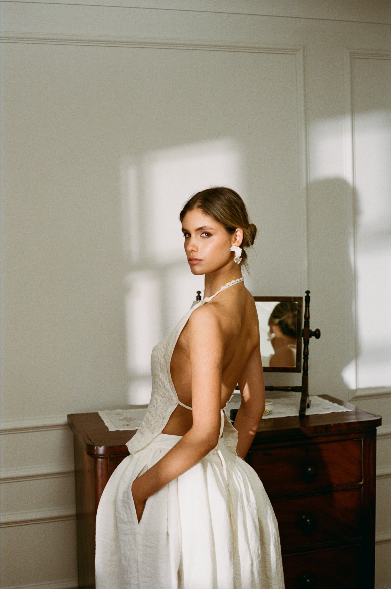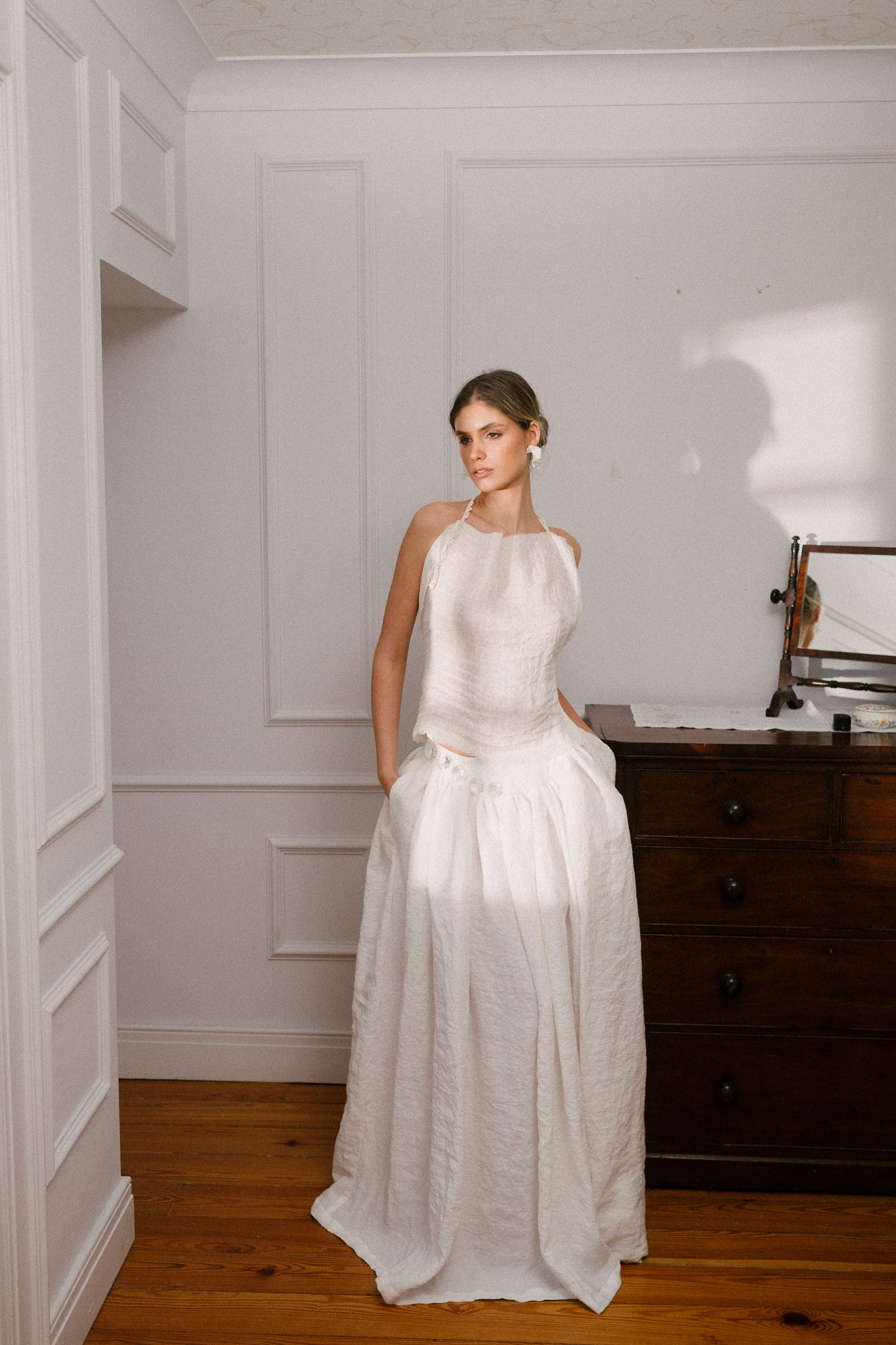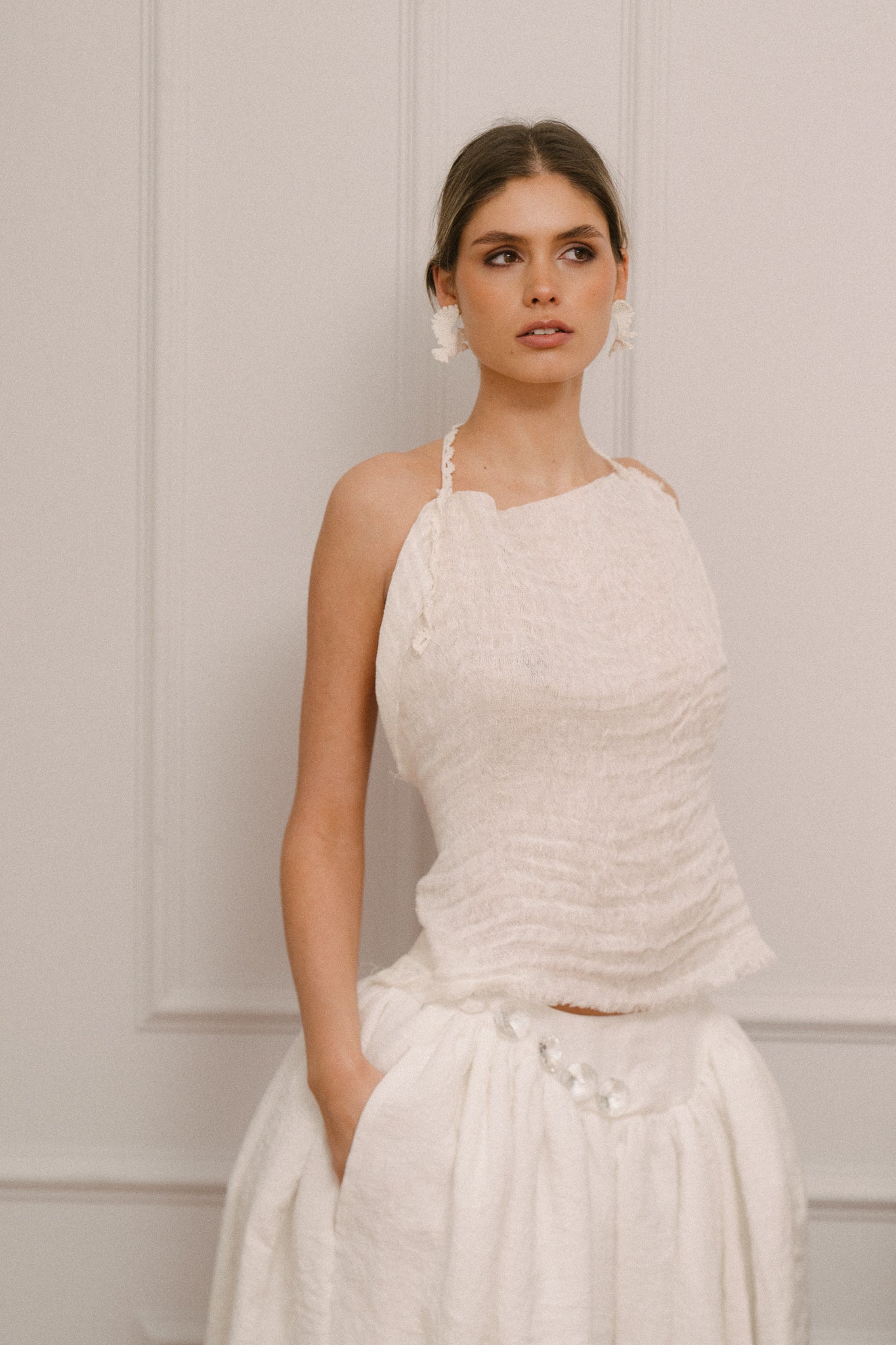 The Emelie Crochet Top is a perfect blend of simplicity and statement. Featuring a hand-crocheted halter detail that fastens at the neck, plus a delicate linen tie around the waist, this piece introduces textural intrigue to your bridal wardrobe. Wear it with our Crystal Full Skirt for an unforgettable look, or pair it with trousers or jeans long after the wedding.