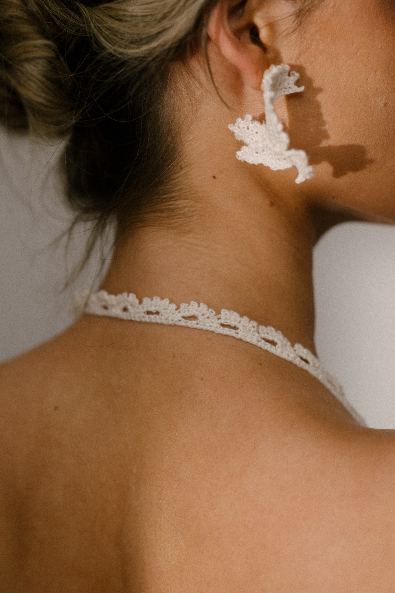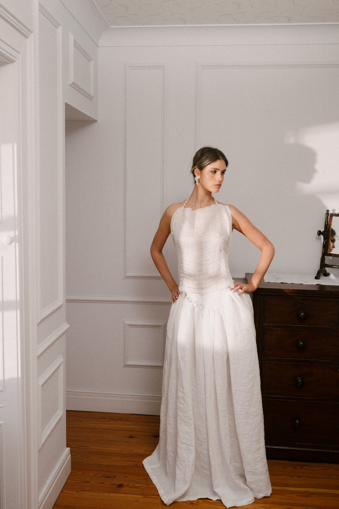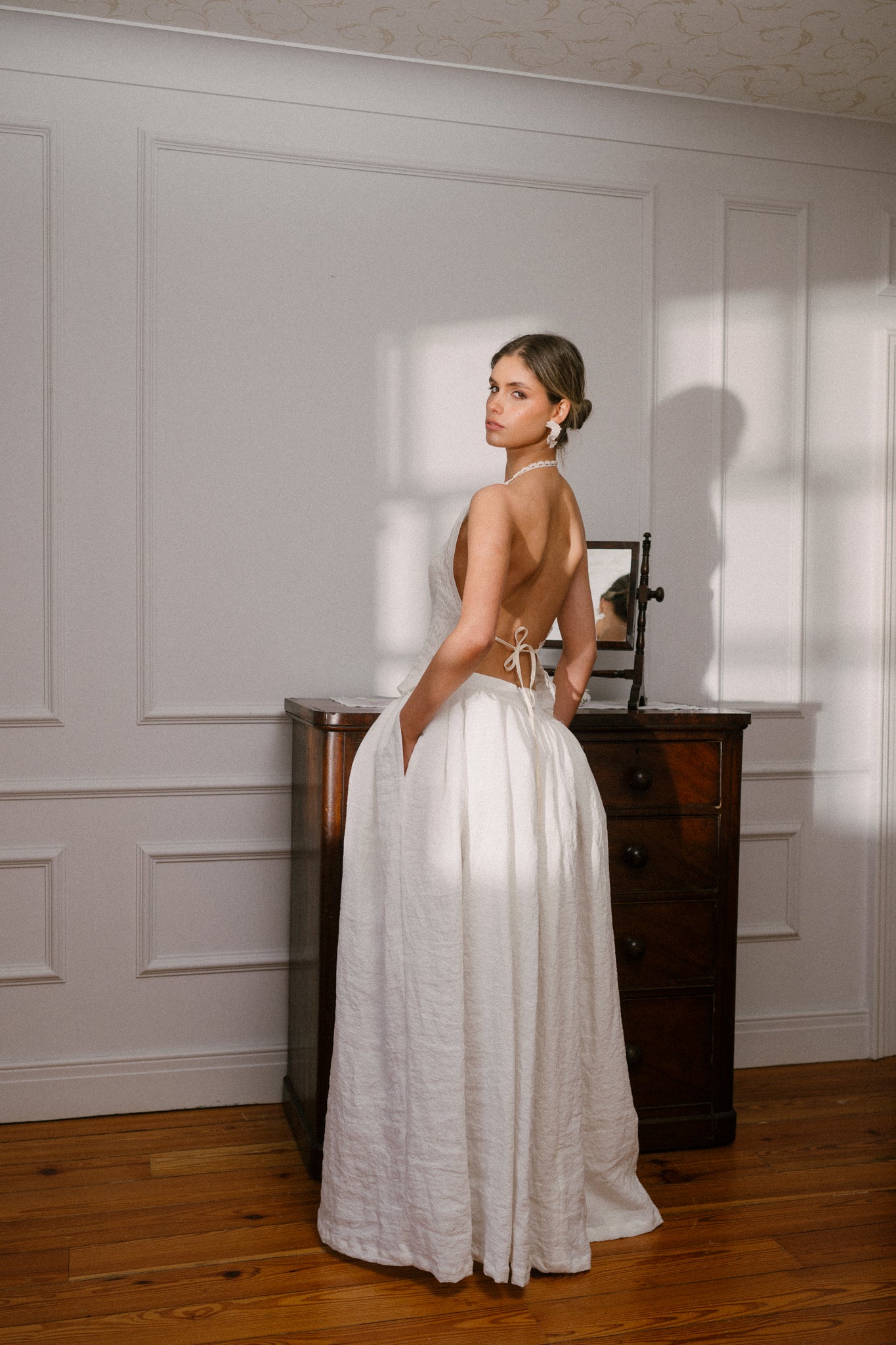 The Emelie Crochet Top is a perfect blend of simplicity and statement. Featuring a hand-crocheted halter detail that fastens at the neck, plus a delicate linen tie around the waist, this piece introduces textural intrigue to your bridal wardrobe. Wear it with our Crystal Full Skirt for an unforgettable look, or pair it with trousers or jeans long after the wedding.