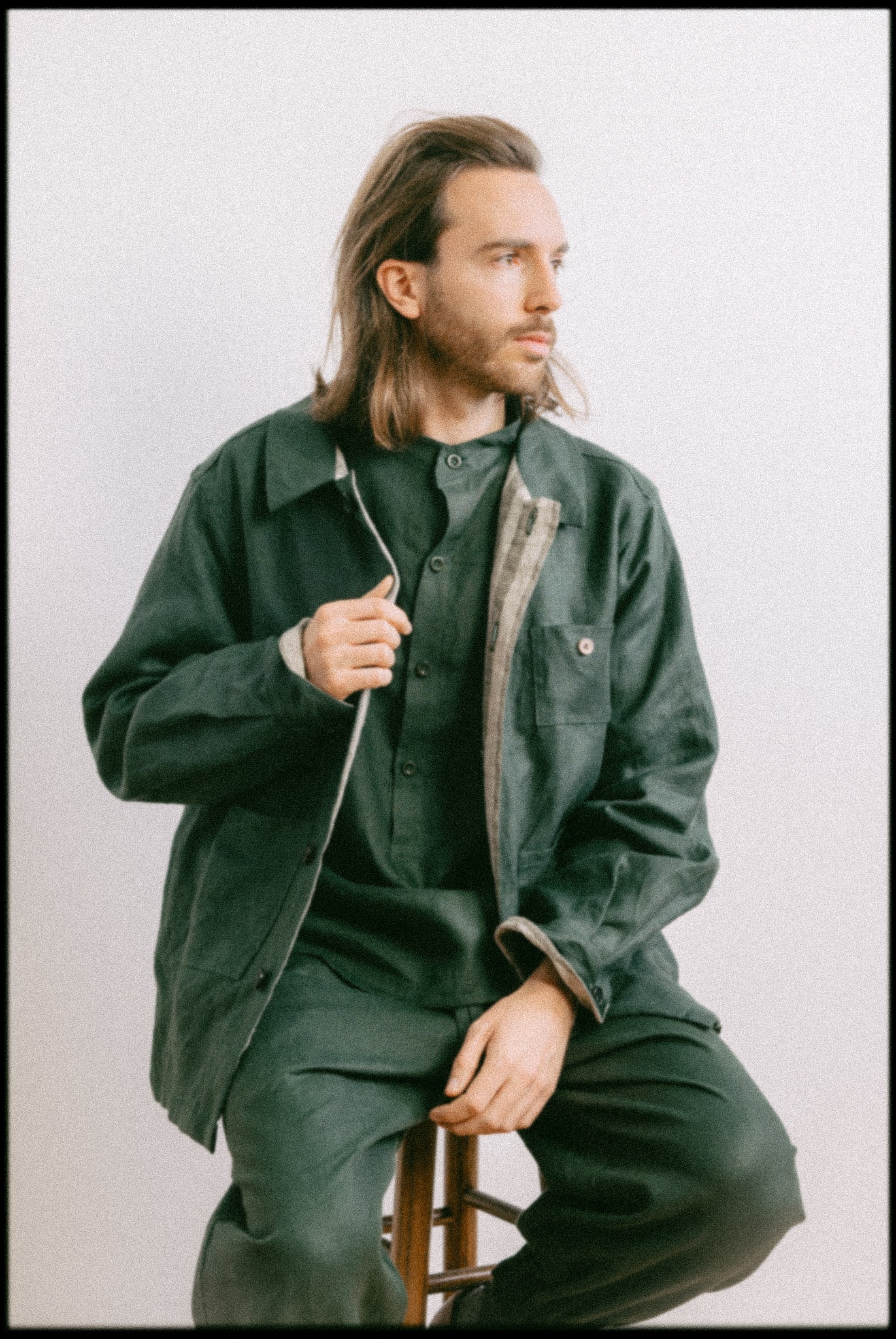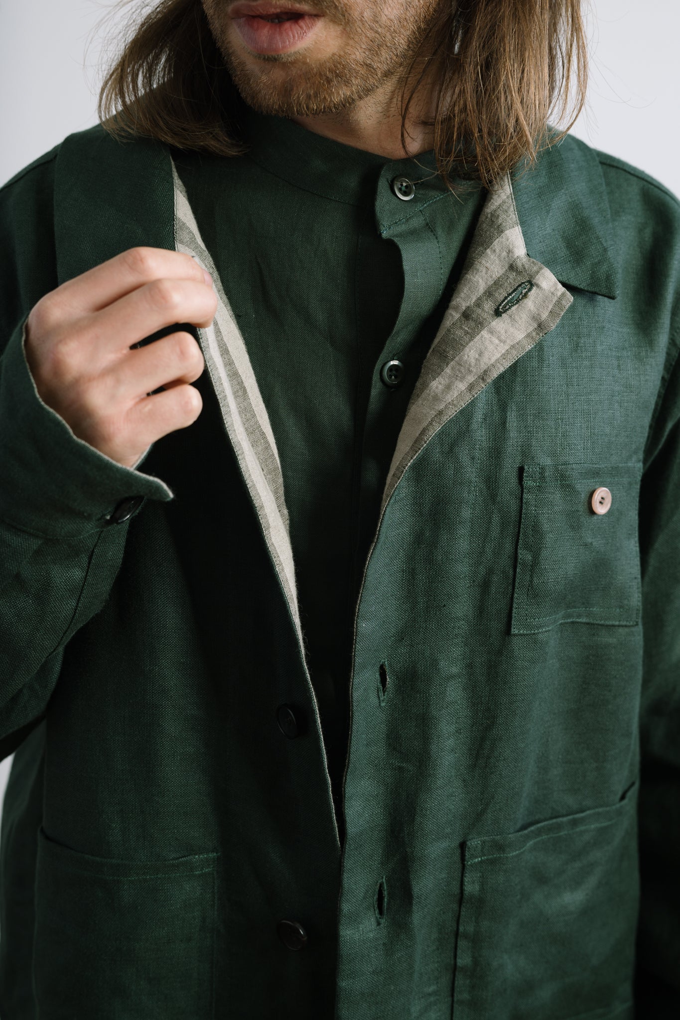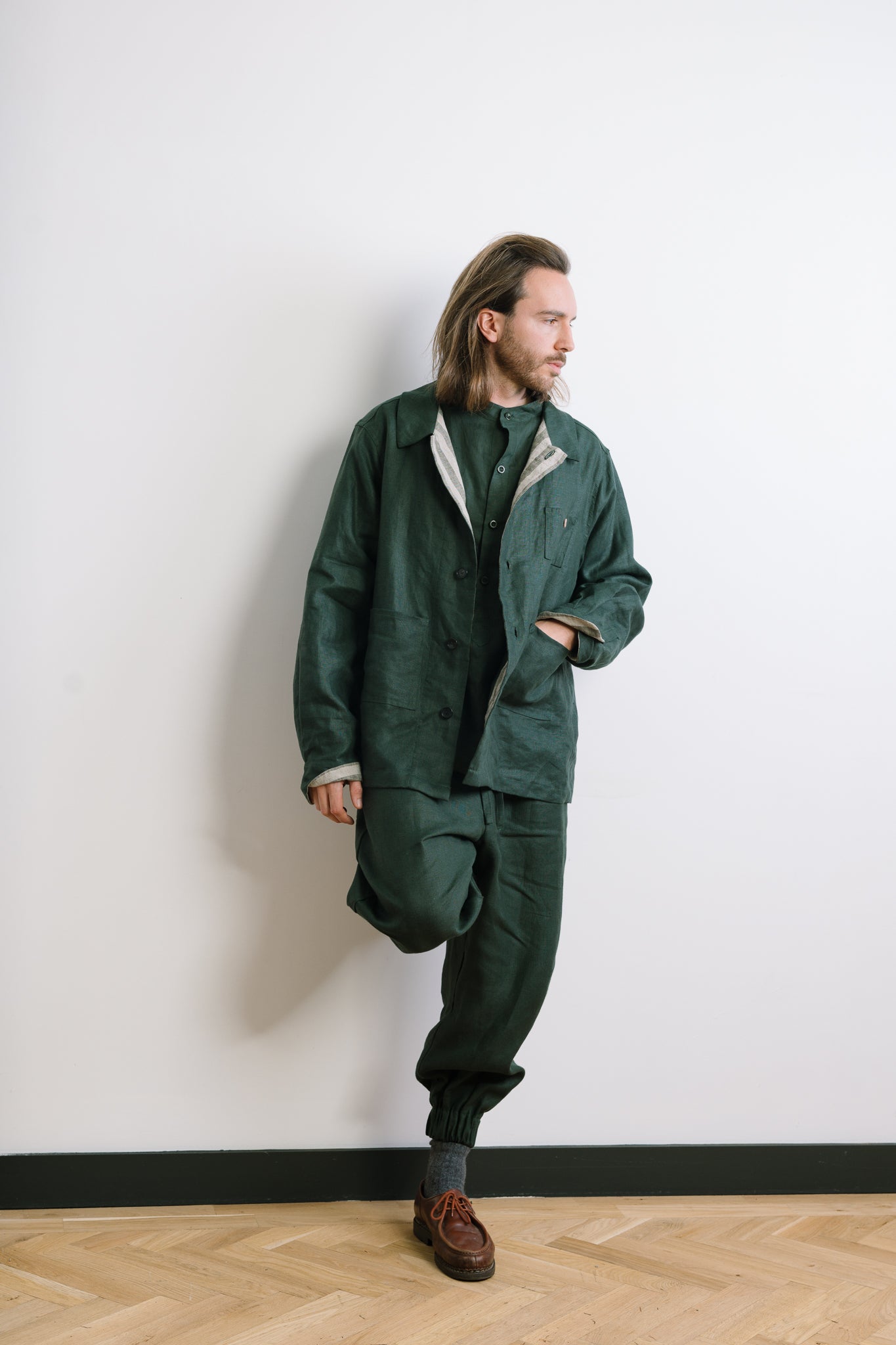 Step into a blend of durability and style with the Forest Overshirt, meticulously crafted from heavyweight Irish linen. This overshirt in a dark forest green serves as a perfect layering piece or a stand-alone garment, designed to elevate both your outdoor and casual events.