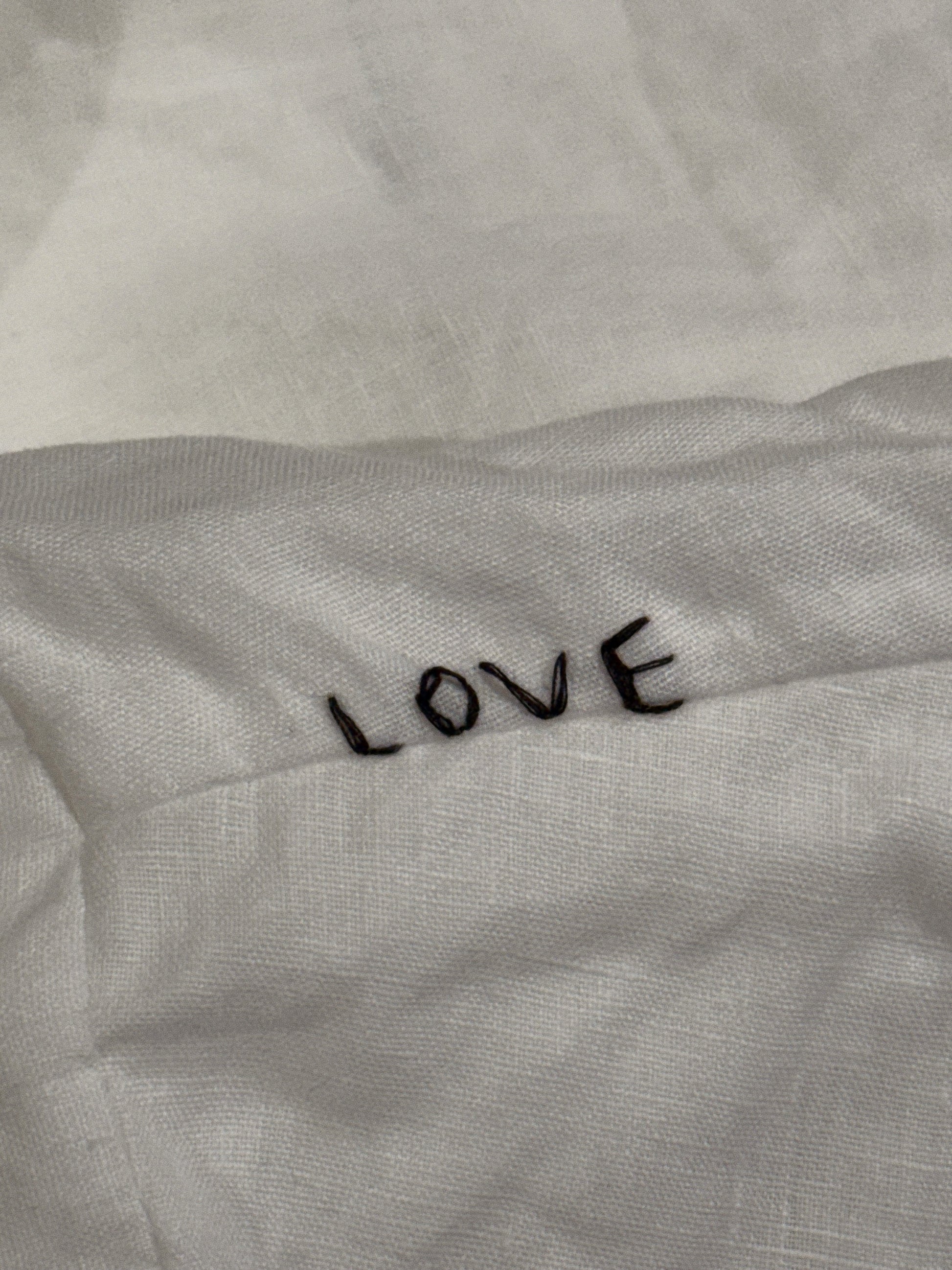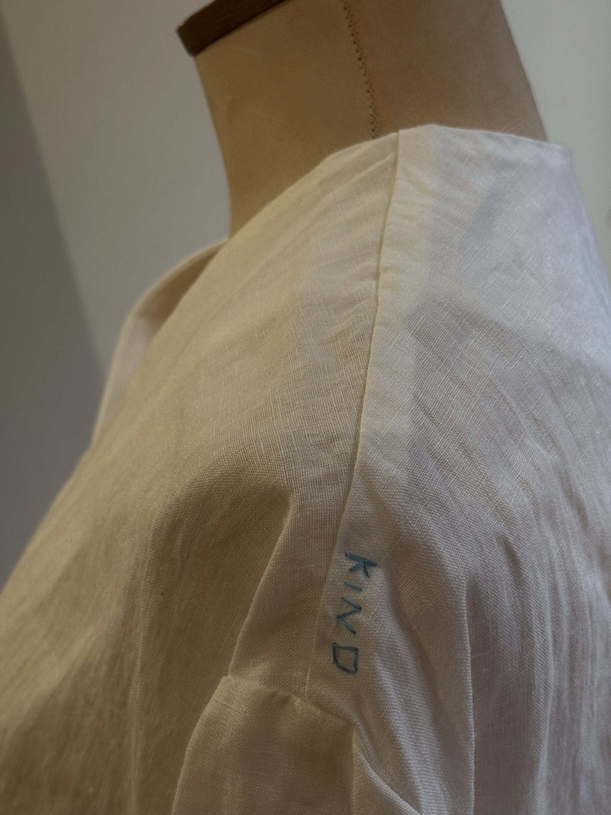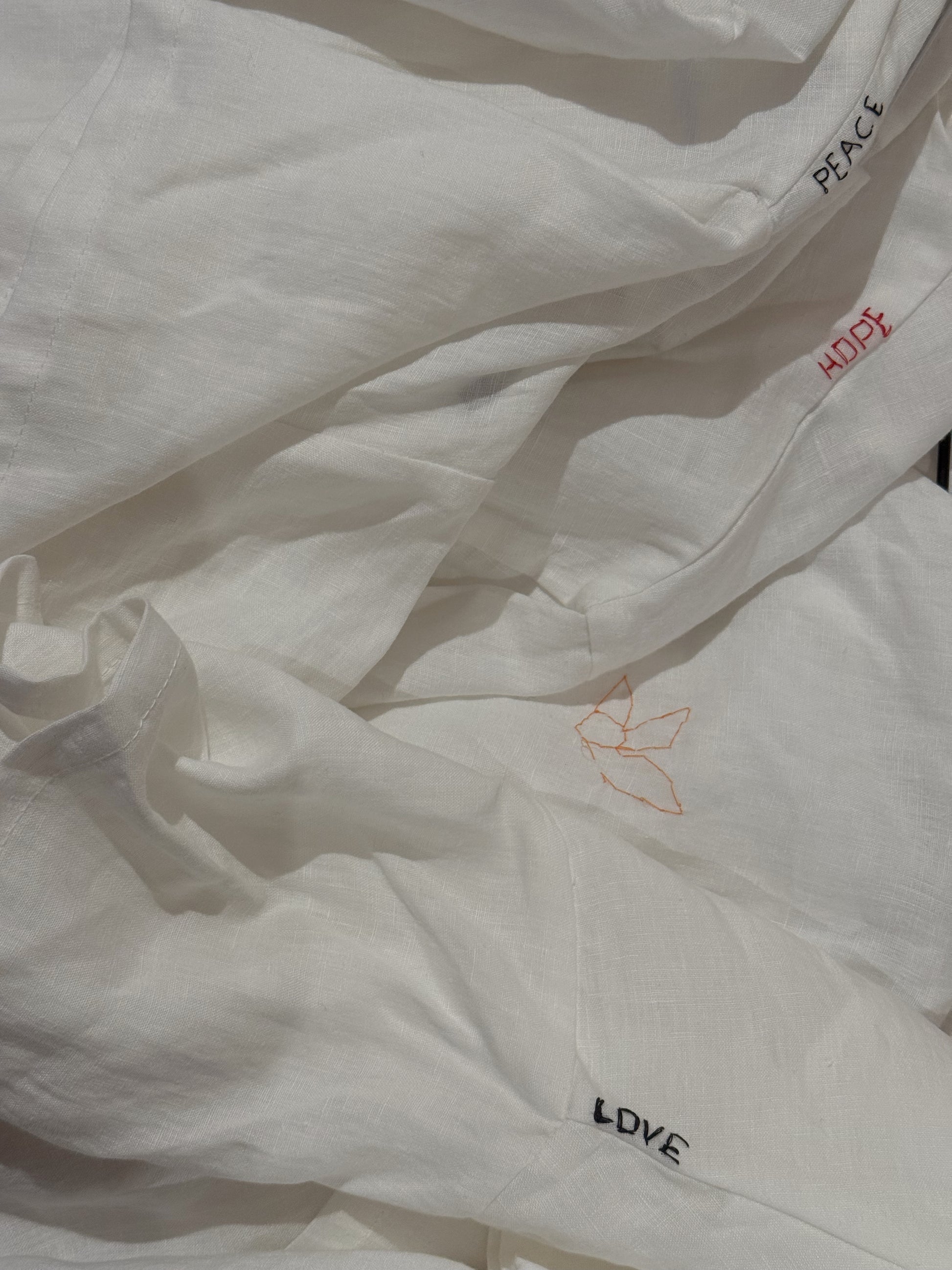 Over recent months, we invited Flourish’s clients, individuals rebuilding their lives through creativity, to take part in a series of embroidery workshops in our Belfast studio. Each person chose a word that holds personal meaning and stitched it by hand, in a colour of their choice, onto one of our linen tees. Words like Joy, Brave, Hope, Home, Free. Every piece carries its own quiet story.