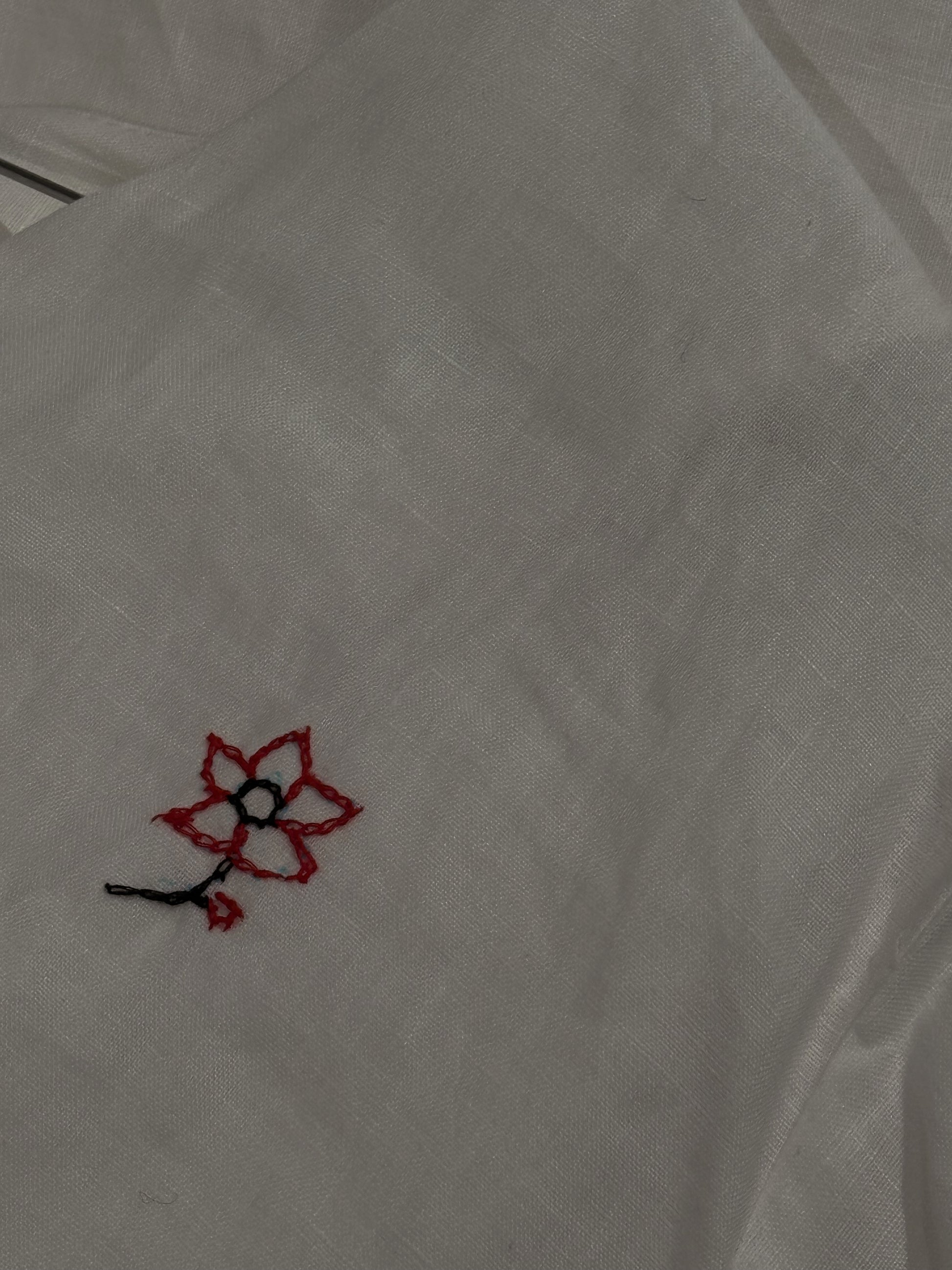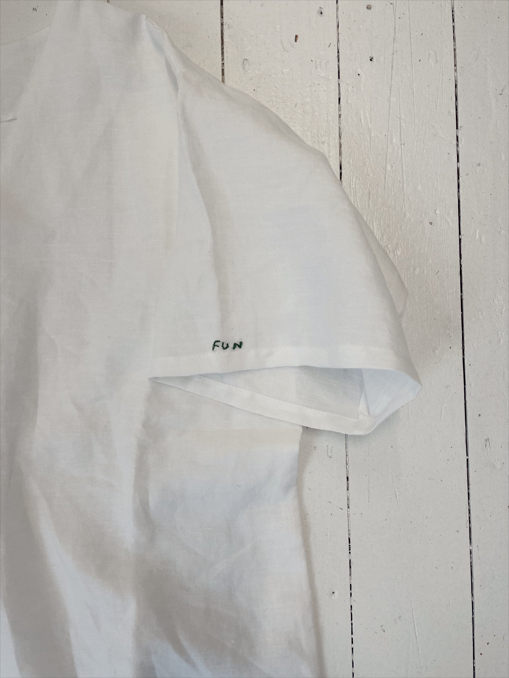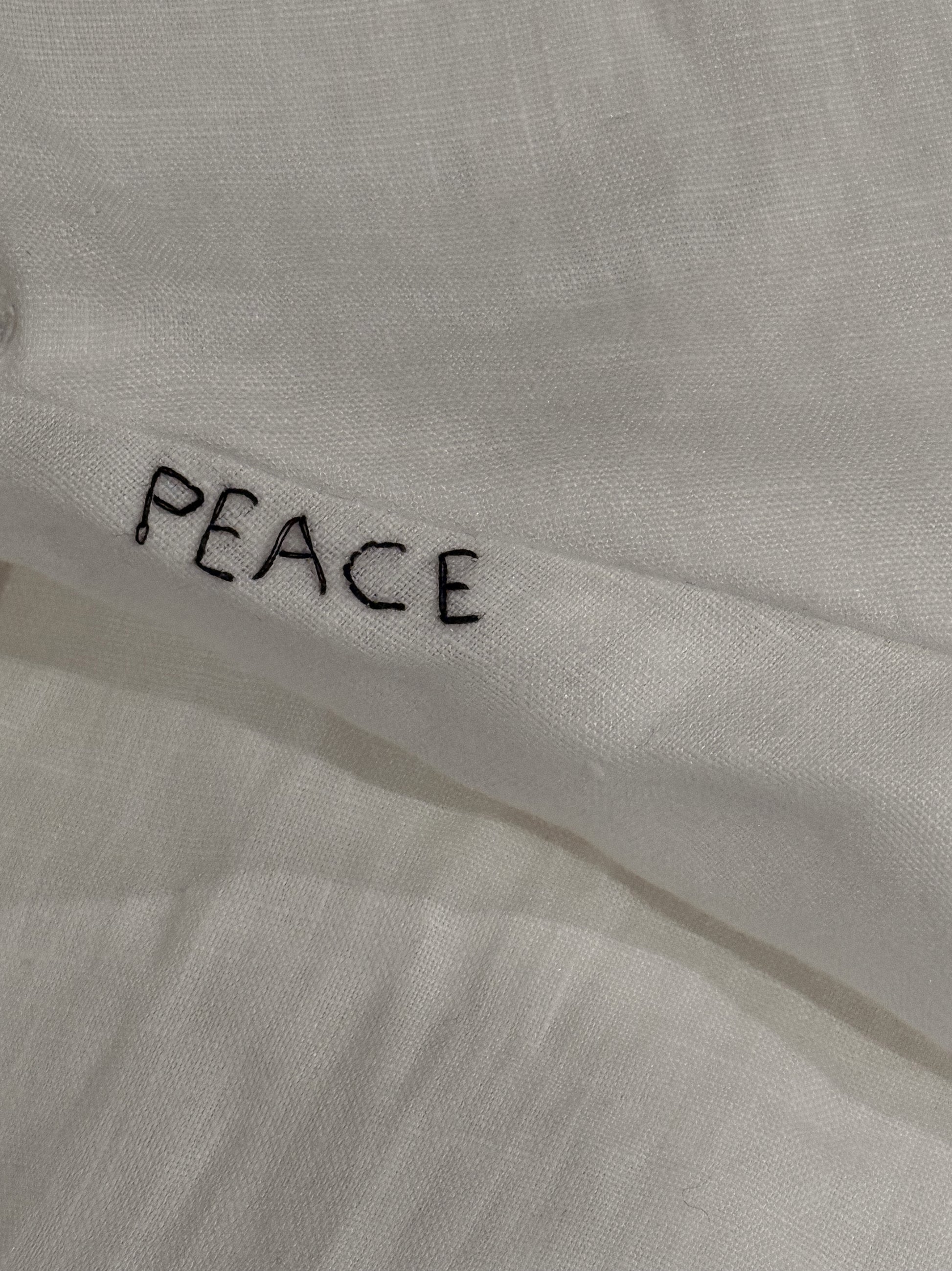 Over recent months, we invited Flourish’s clients, individuals rebuilding their lives through creativity, to take part in a series of embroidery workshops in our Belfast studio. Each person chose a word that holds personal meaning and stitched it by hand, in a colour of their choice, onto one of our linen tees. Words like Joy, Brave, Hope, Home, Free. Every piece carries its own quiet story.