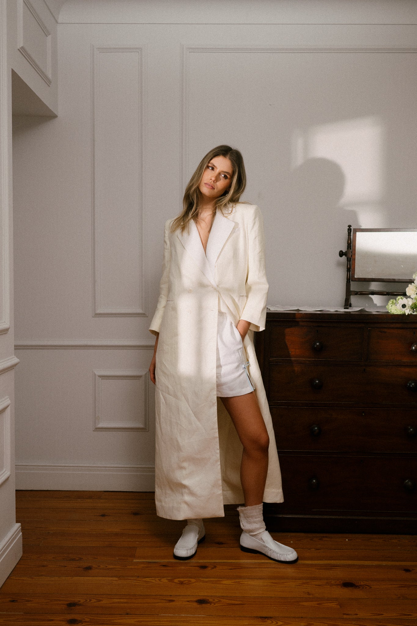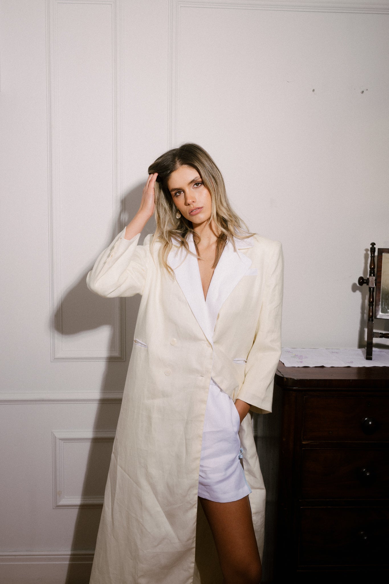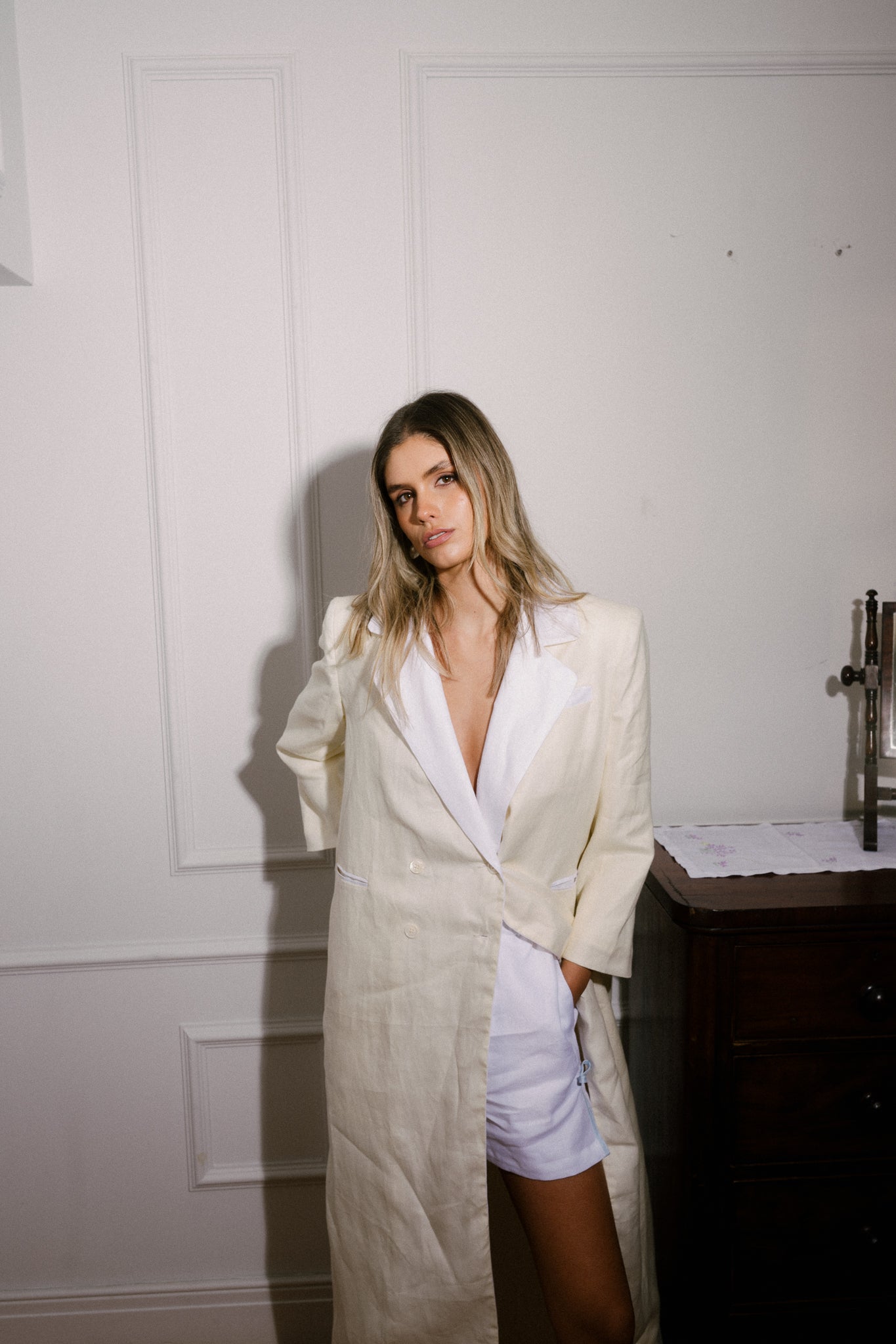 - Longline blazer silhouette in ivory twill linen