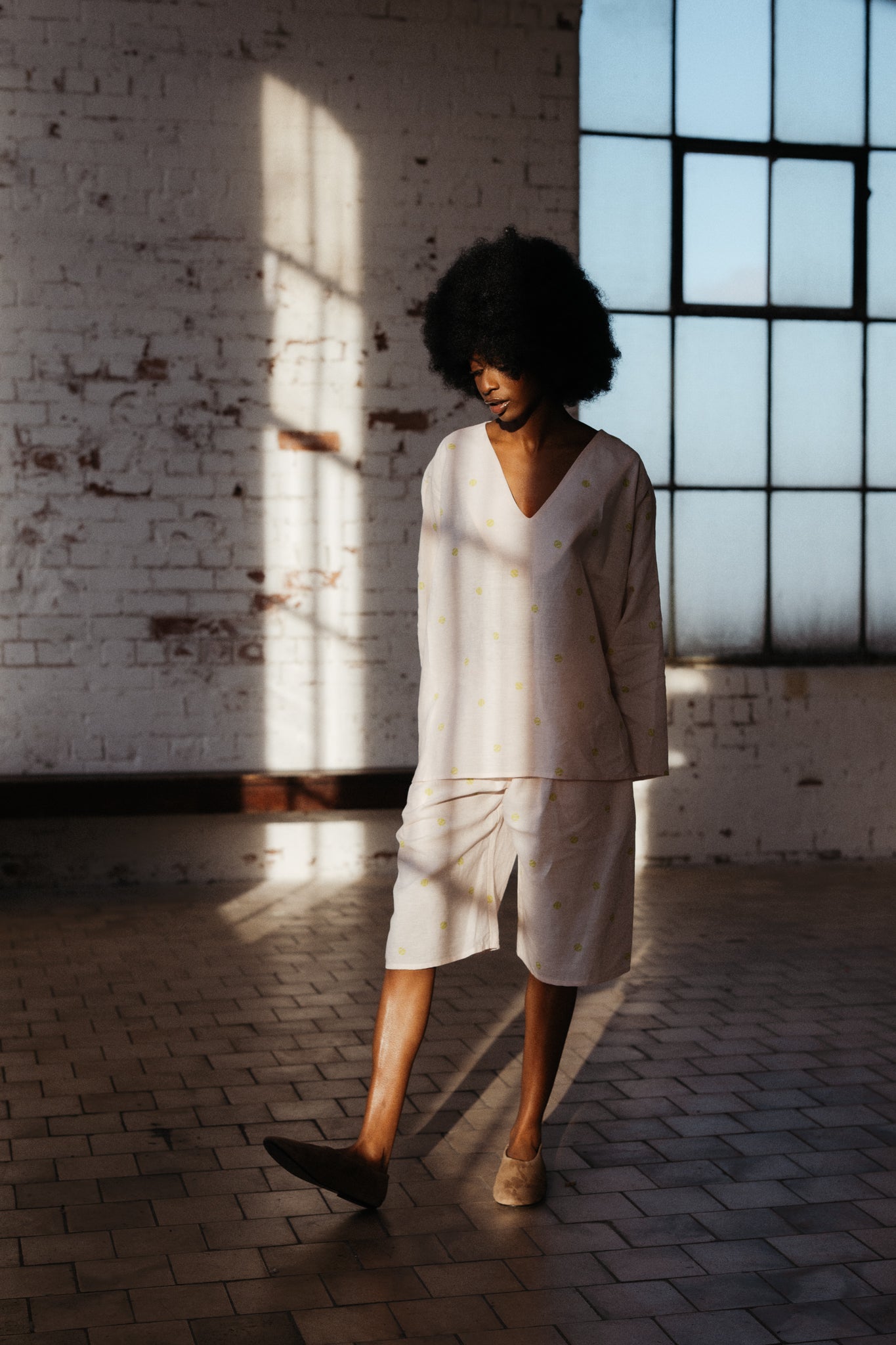 The longer length gives the silhouette a slightly more elevated feel, while the elasticated waist keeps them effortless and easy to wear. There is something both playful and polished about the balance of the print and the shape. Worn with the matching Margot Top, they make for a summer set that feels distinctive, joyful and beautifully put together.
