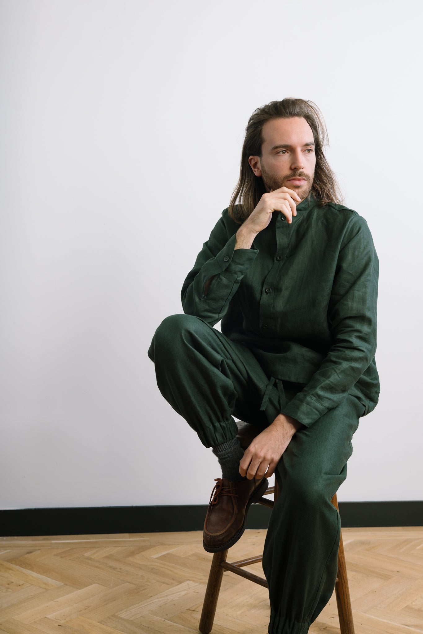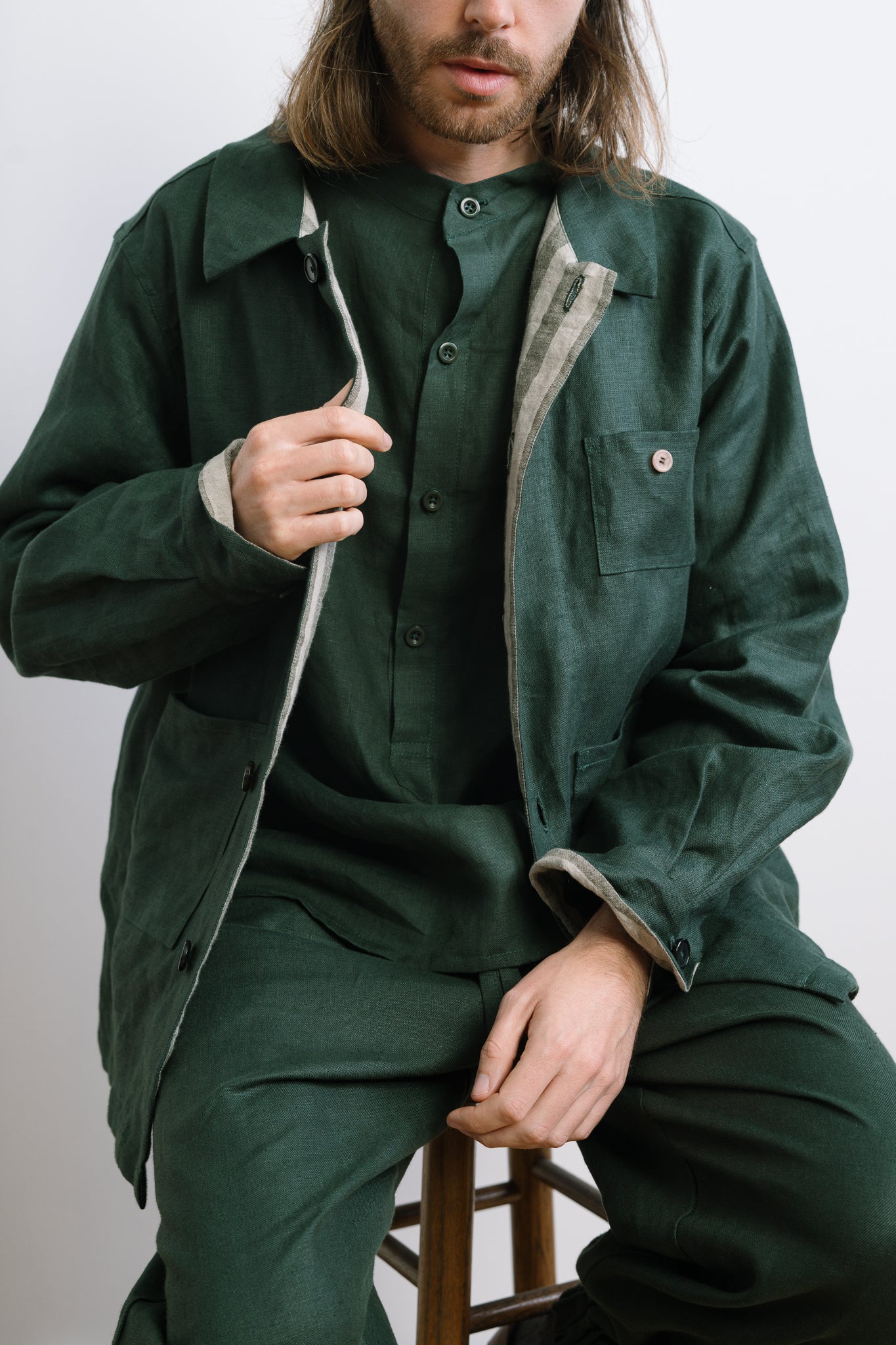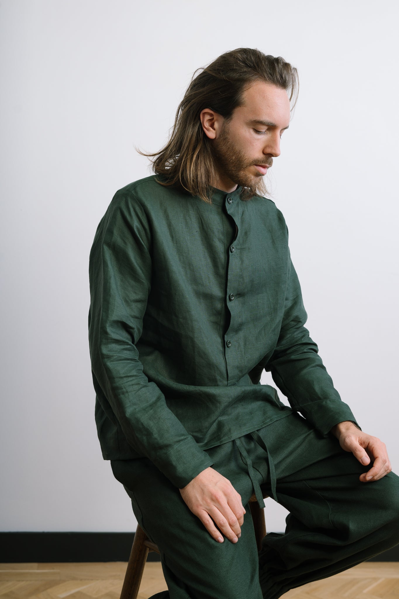 The Maverick Shirt in Emerald Green channels the essence of modern versatility. Designed for the contemporary man but equally stylish as an oversized option for women, this shirt blends tradition with a playful twist. The relaxed fit and grandad collar underscore a laid-back yet sophisticated style, perfect for layering or standing alone.
