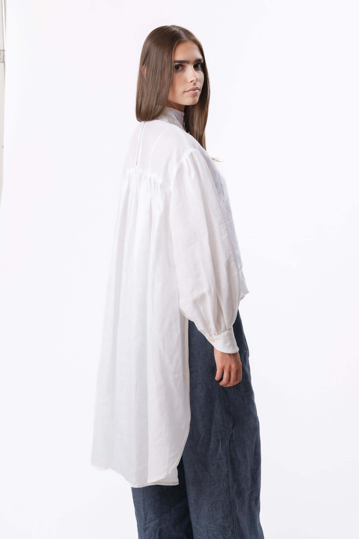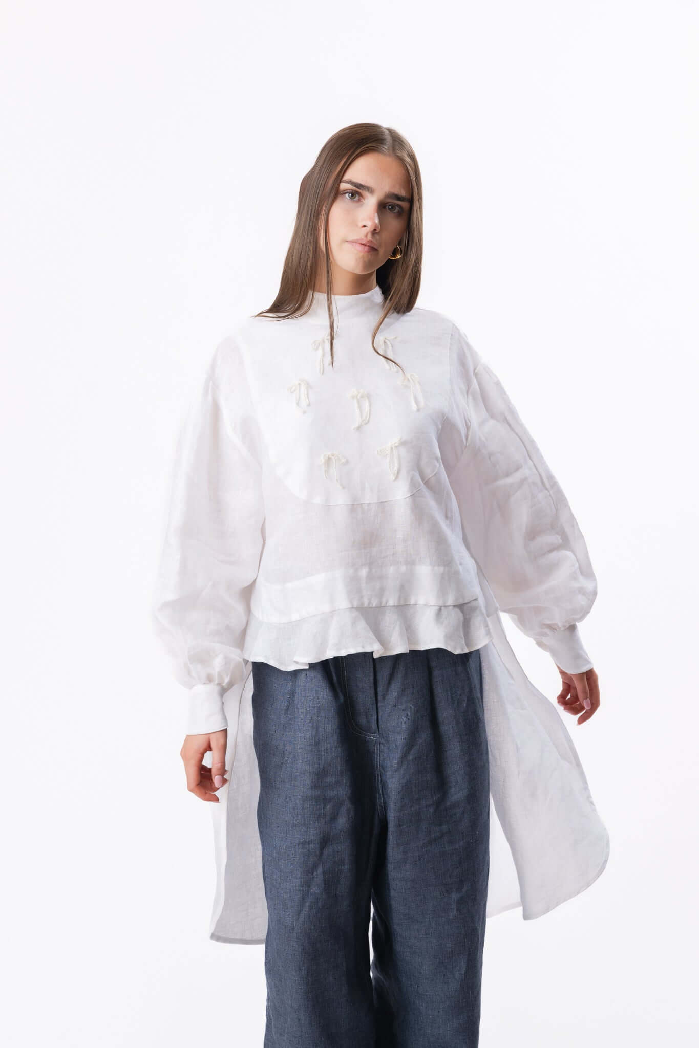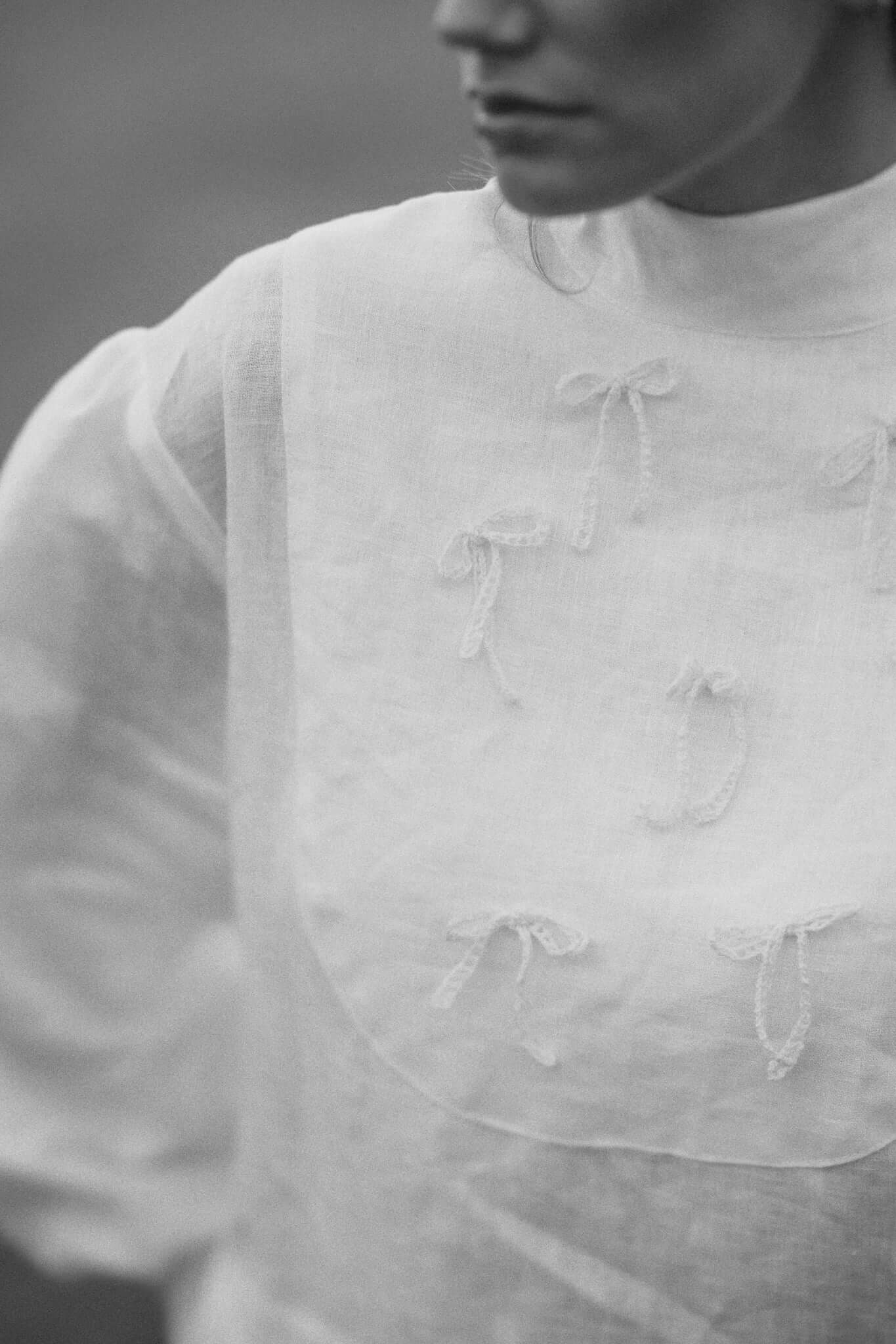 Made in a crisp white Irish linen, it balances strength and softness with its high neckline, sculptural bib front, and flowing gathered back. Hand-crocheted bow appliqués adorn the front, lending a touch of charm and craftsmanship, while the bias-cut ruffle hem adds gentle movement as you walk. The dramatic tail — its most striking feature — flows elegantly behind, and pairs beautifully with our new season Keeper Tailcoat.