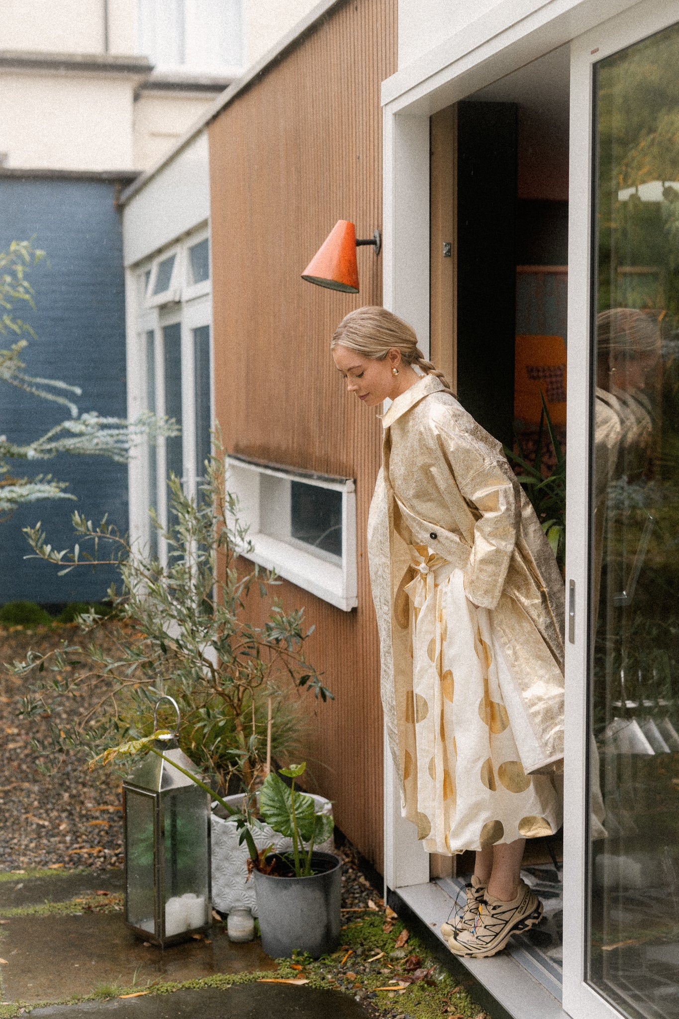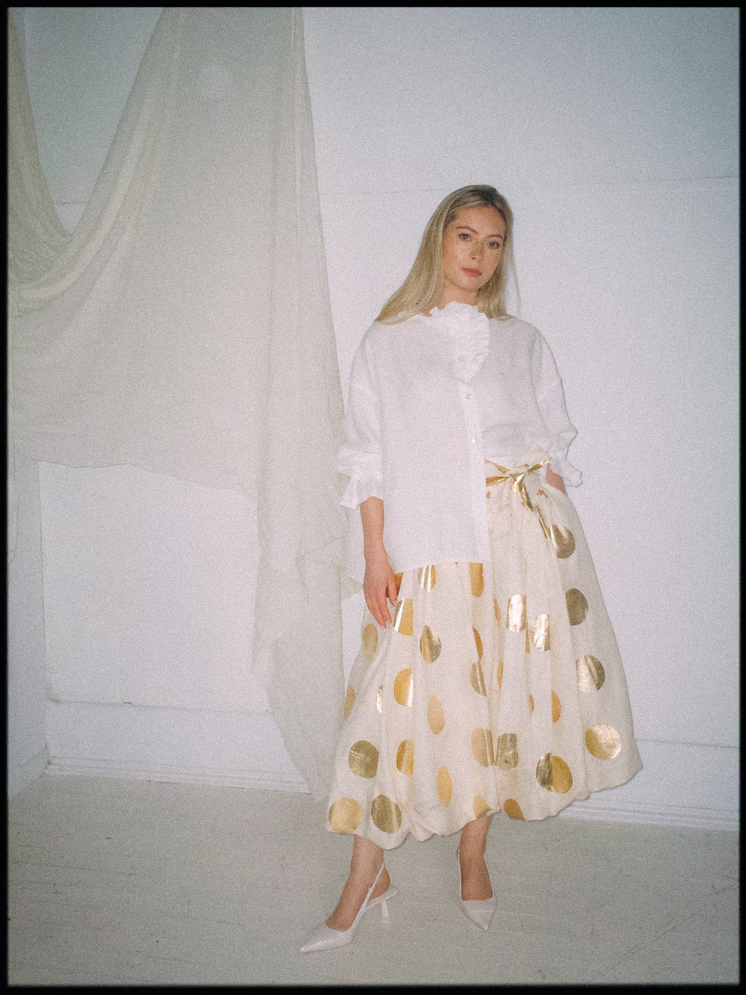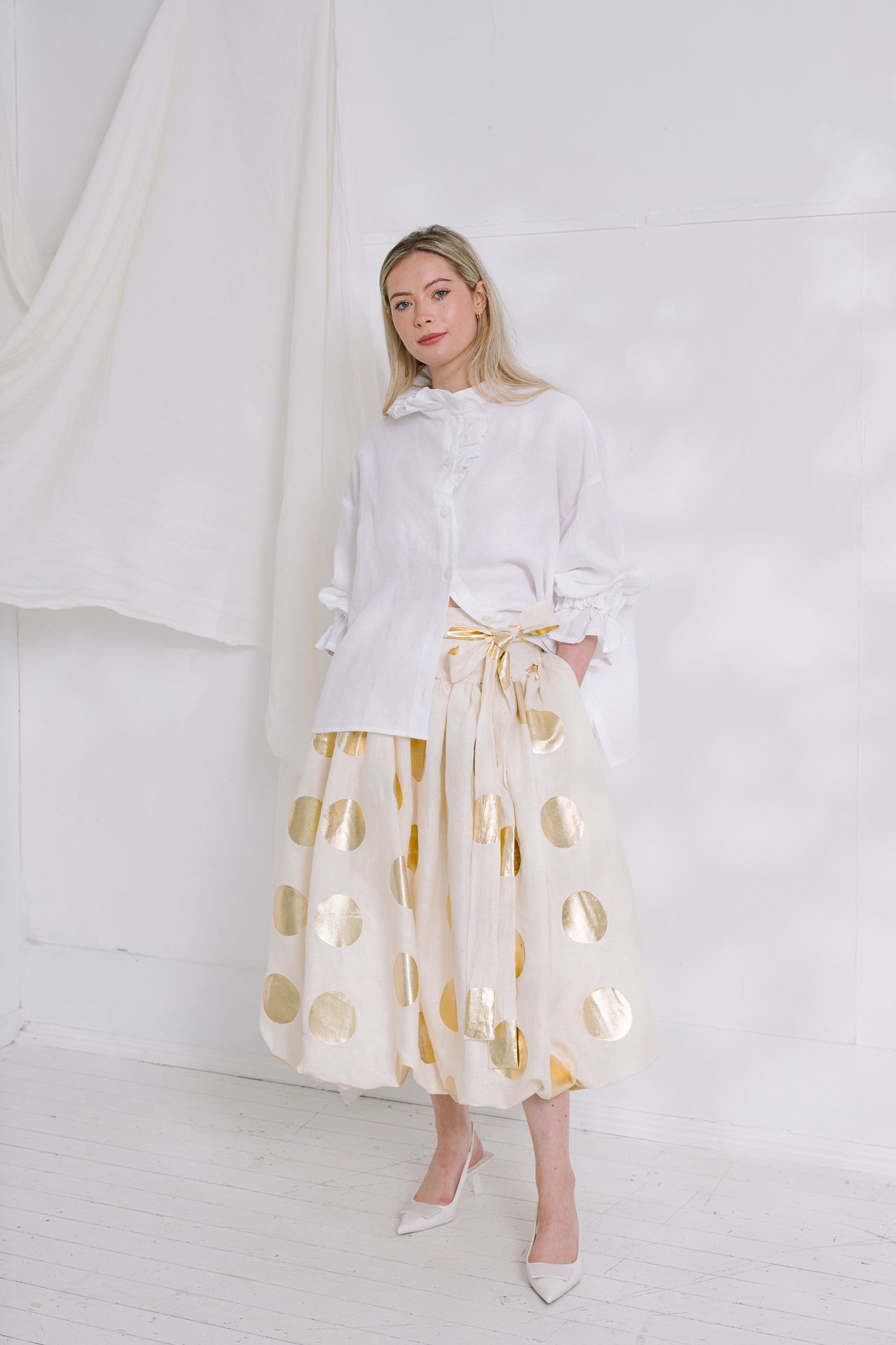 Introducing our Parachute Skirt, a bold new addition inspired by the theme of wind and freedom. Crafted with our bespoke metallic gold beetled polka dot fabric, this skirt captures the playful yet elegant essence of movement with a balloon hem.