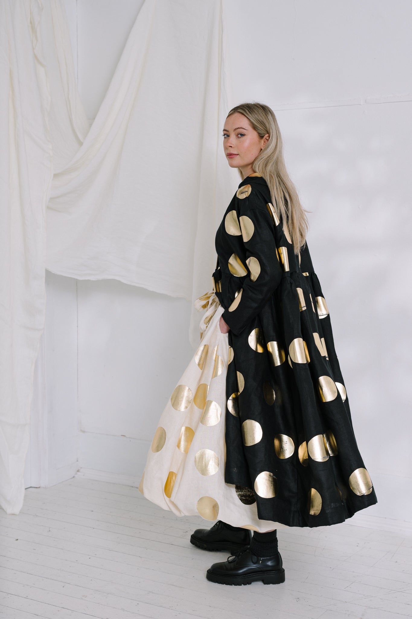 The voluminous silhouette flows effortlessly, while the wrap-tie waist adds versatility and structure. Each gold polka dot shimmers against the soft ivory linen, creating a striking contrast that catches the light beautifully.