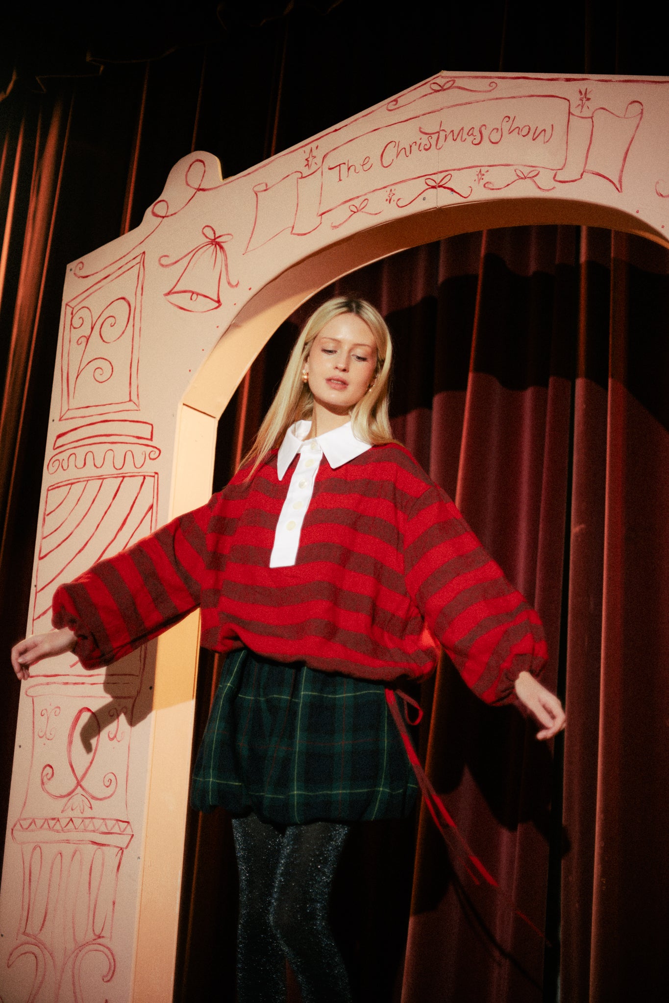 The Rugby Shirt is a festive reimagining of our popular SS25 piece. This winter version features deep red and forest green stripes, a crisp white collar and button placket, elasticated cuffs, and a drawstring hem you can adjust to suit your style. Wear it cinched for shape or loose for a relaxed look.