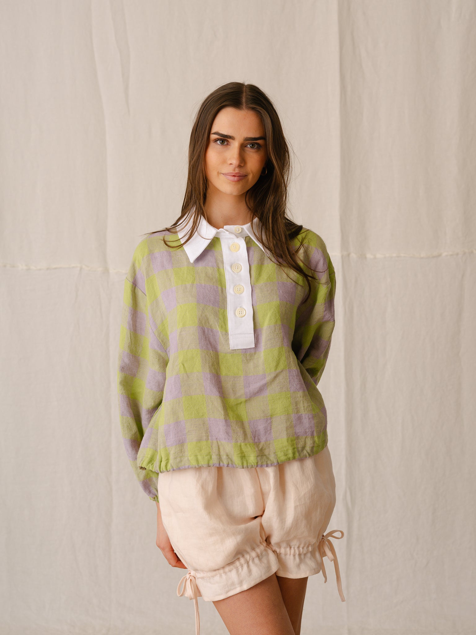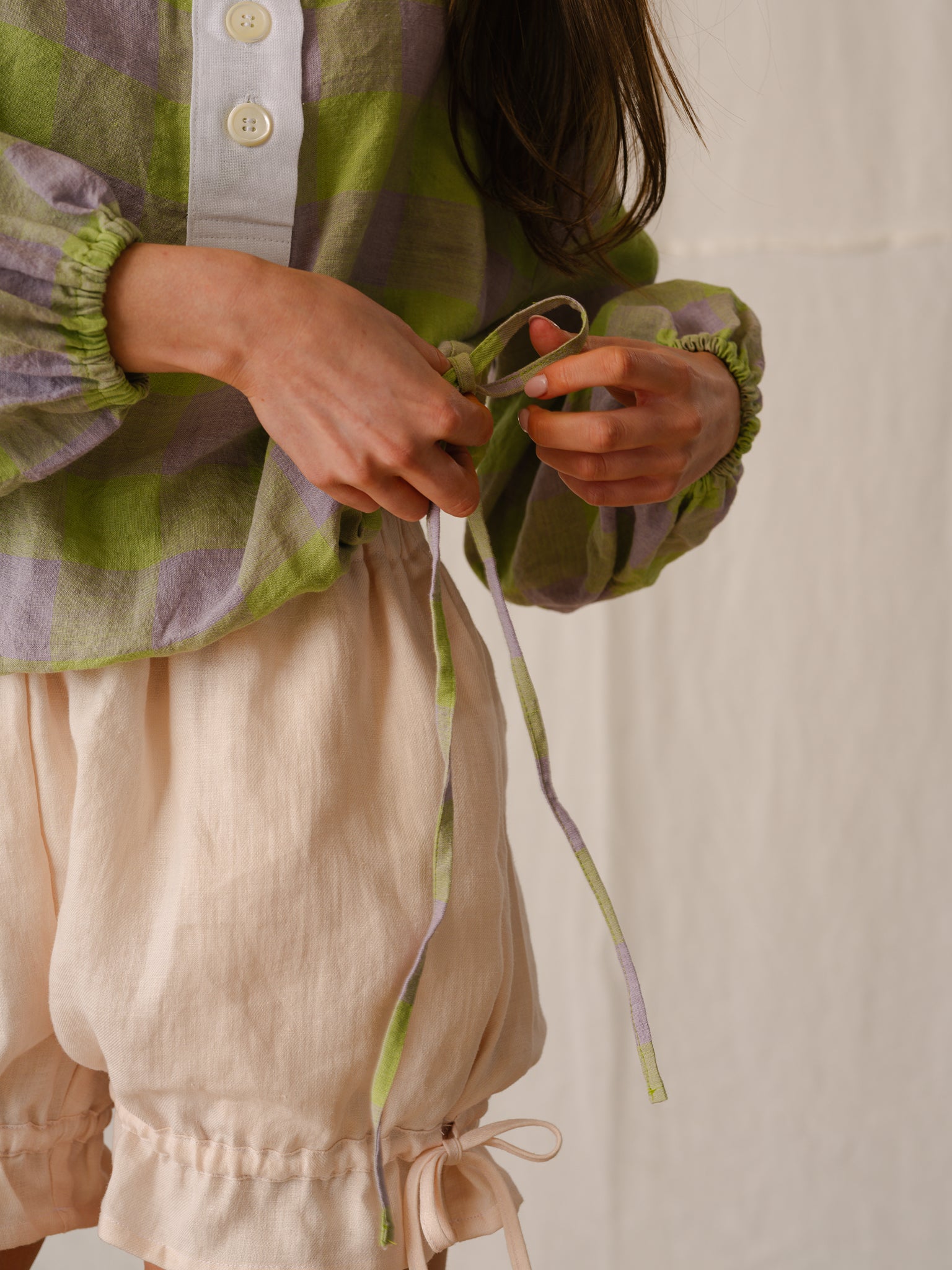 Our Rugby Kit brings together two of the most playful pieces in Within the Garden. The Rugby Shirt returns for spring summer in Limelight, a fresh checked linen that brings a real sense of lightness and fun to the collection. Paired with our soft pink Shortie Bloomers, the set feels sporty, feminine and a little nostalgic all at once — designed for days outdoors, easy movement and a playful kind of dressing.