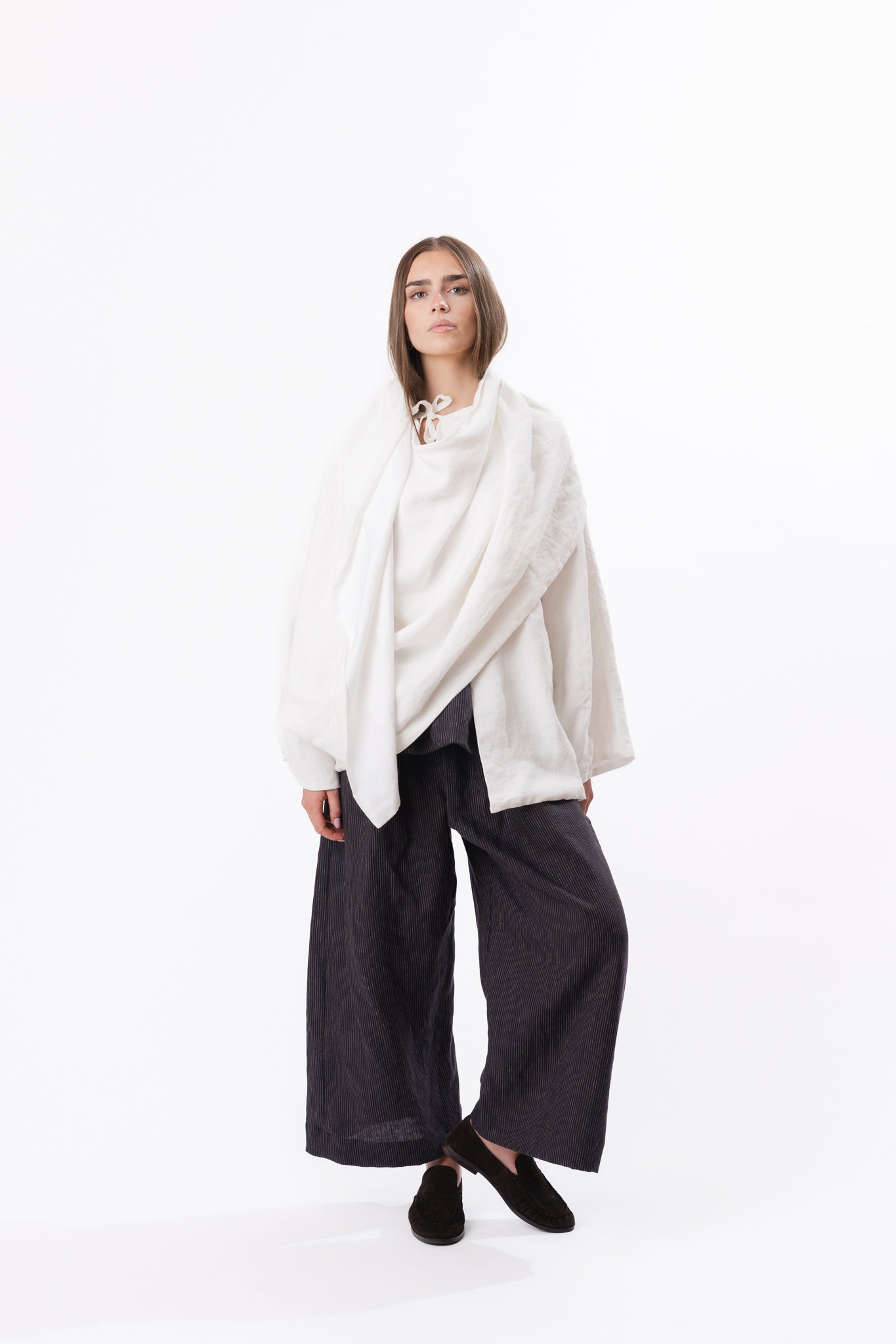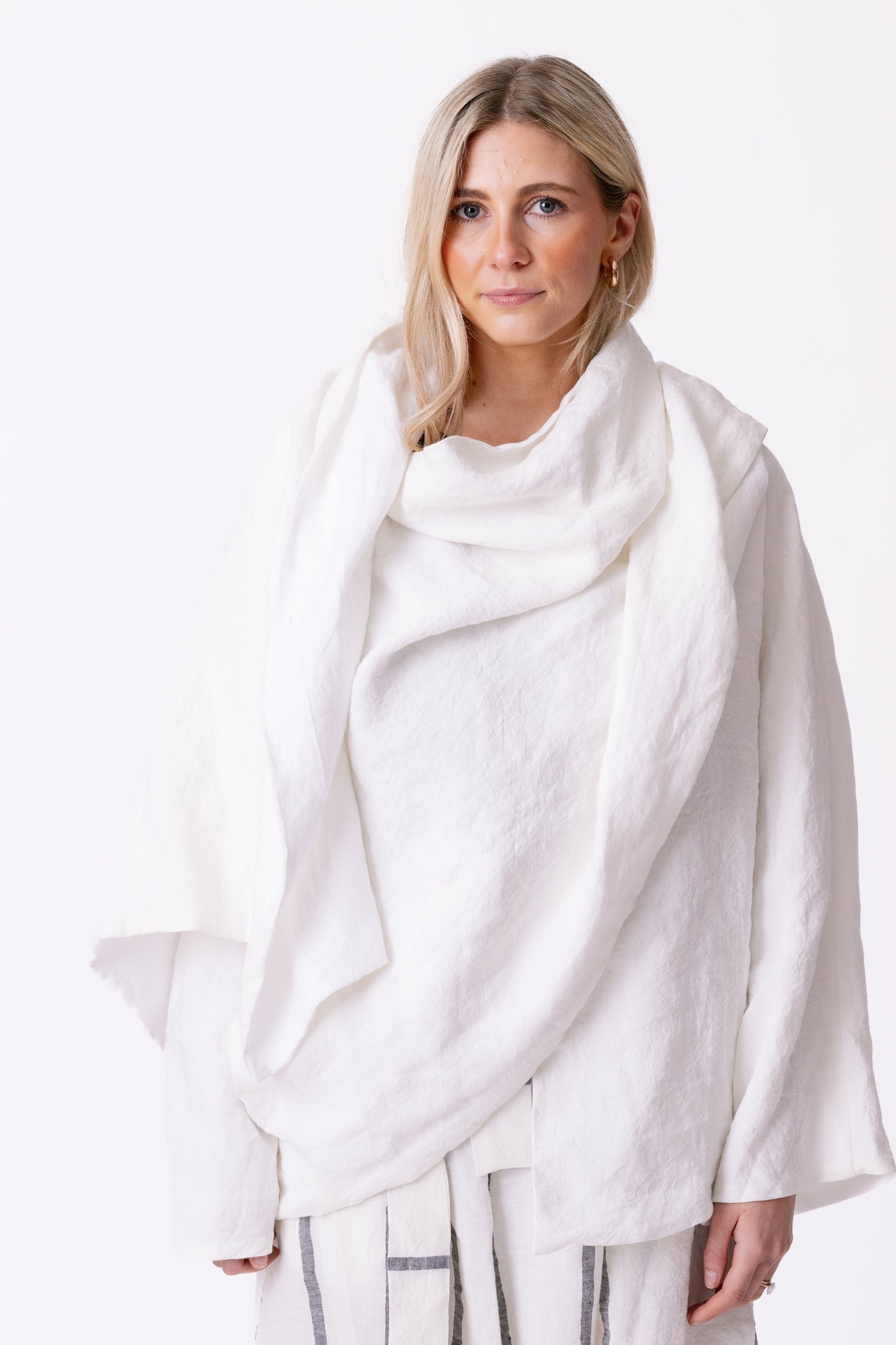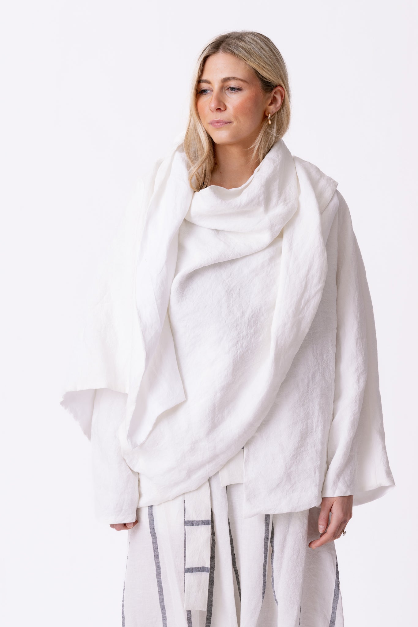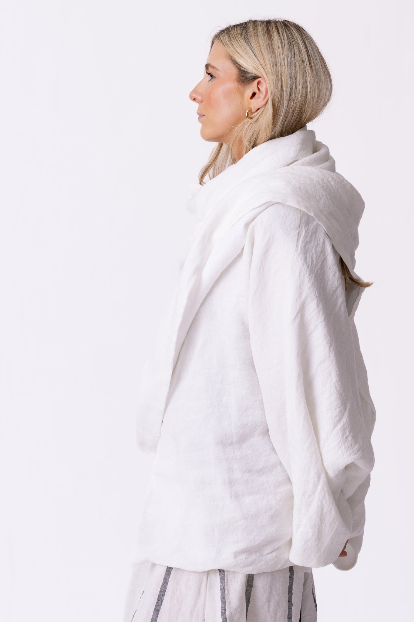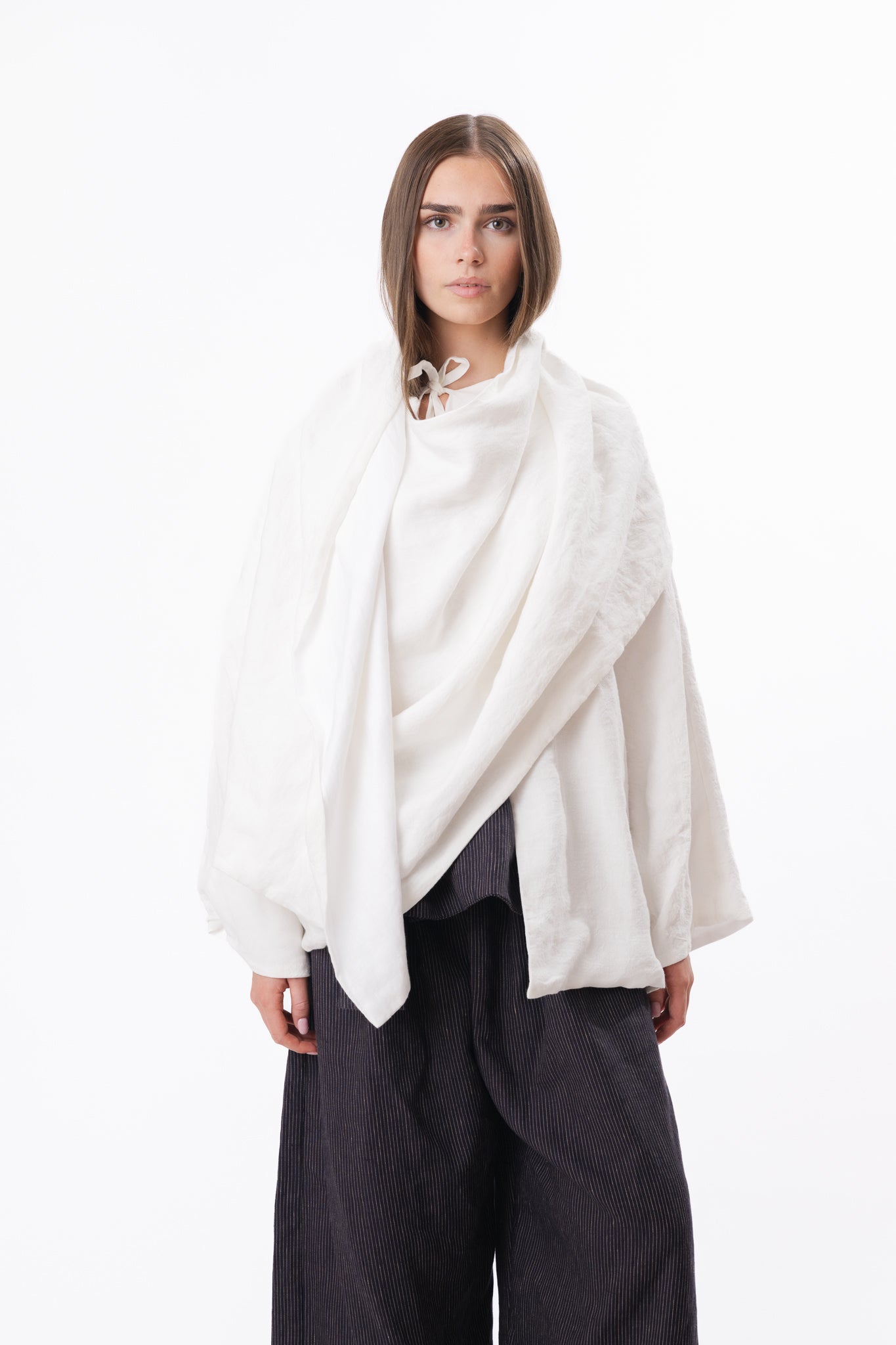 Designed as a loose-fitting jacket with an oversized wrap scarf, it can be draped, knotted, or layered, with hidden ties to secure the silhouette while keeping its effortless drape. Its cocoon-like silhouette holds both strength and gentleness, an outer layer that feels like protection yet carries a quiet, contemporary grace.