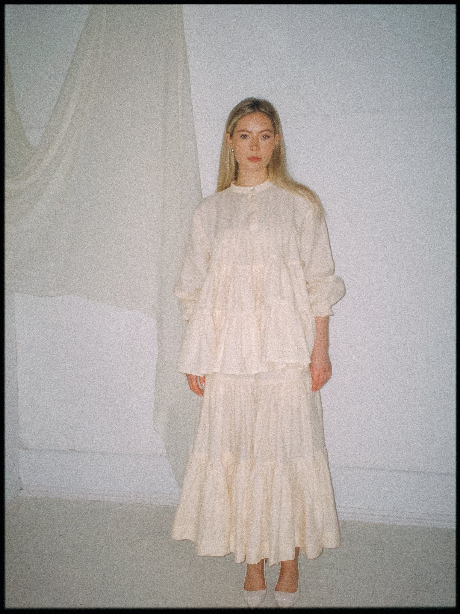 Our "Stormy Set" is an ethereal combination, blending timeless femininity with elegance. Crafted from pure Irish linen, the set features delicate hand-gathered tiers that create a dreamy, flowing silhouette. The natural ecru shade complements any wardrobe while the soft structure moves gracefully with every breeze. Perfect for pairing together for an effortlessly chic statement look or styled separately for versatile sophistication.