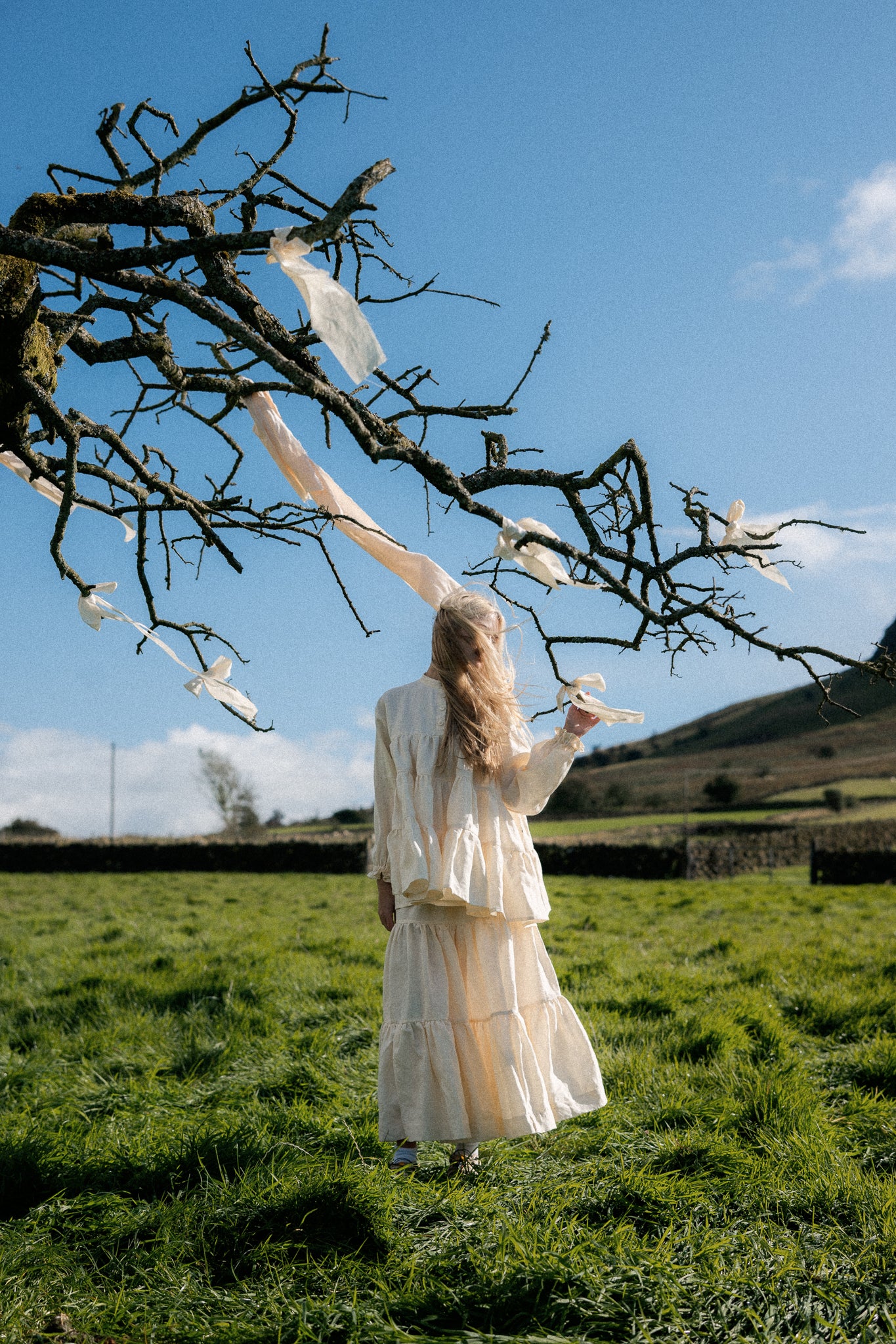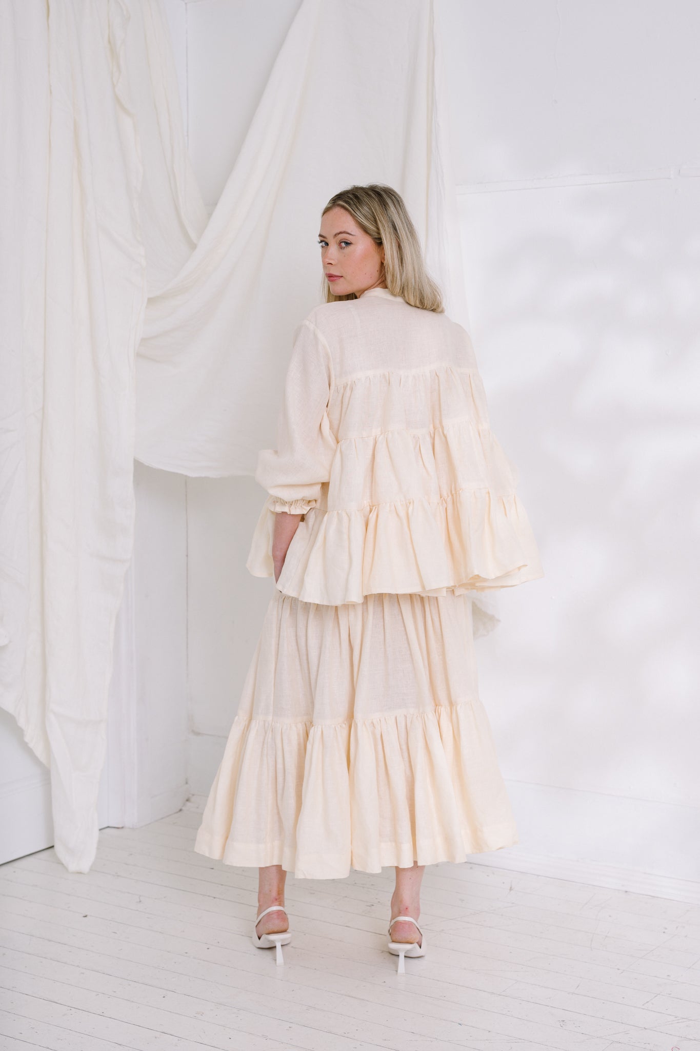 Our "Stormy Set" is an ethereal combination, blending timeless femininity with elegance. Crafted from pure Irish linen, the set features delicate hand-gathered tiers that create a dreamy, flowing silhouette. The natural ecru shade complements any wardrobe while the soft structure moves gracefully with every breeze. Perfect for pairing together for an effortlessly chic statement look or styled separately for versatile sophistication.
