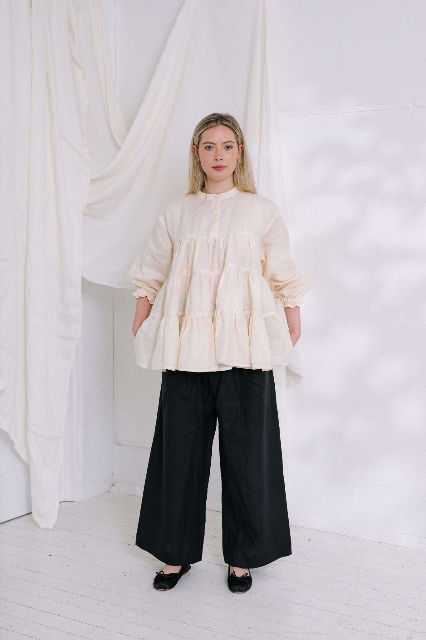 The “Stormy Shirt" brings a playful, voluminous silhouette with its carefully structured, hand-stitched tiers. Made from soft Irish linen, it pairs beautifully with tailored trousers or jeans for an effortlessly elegant look.