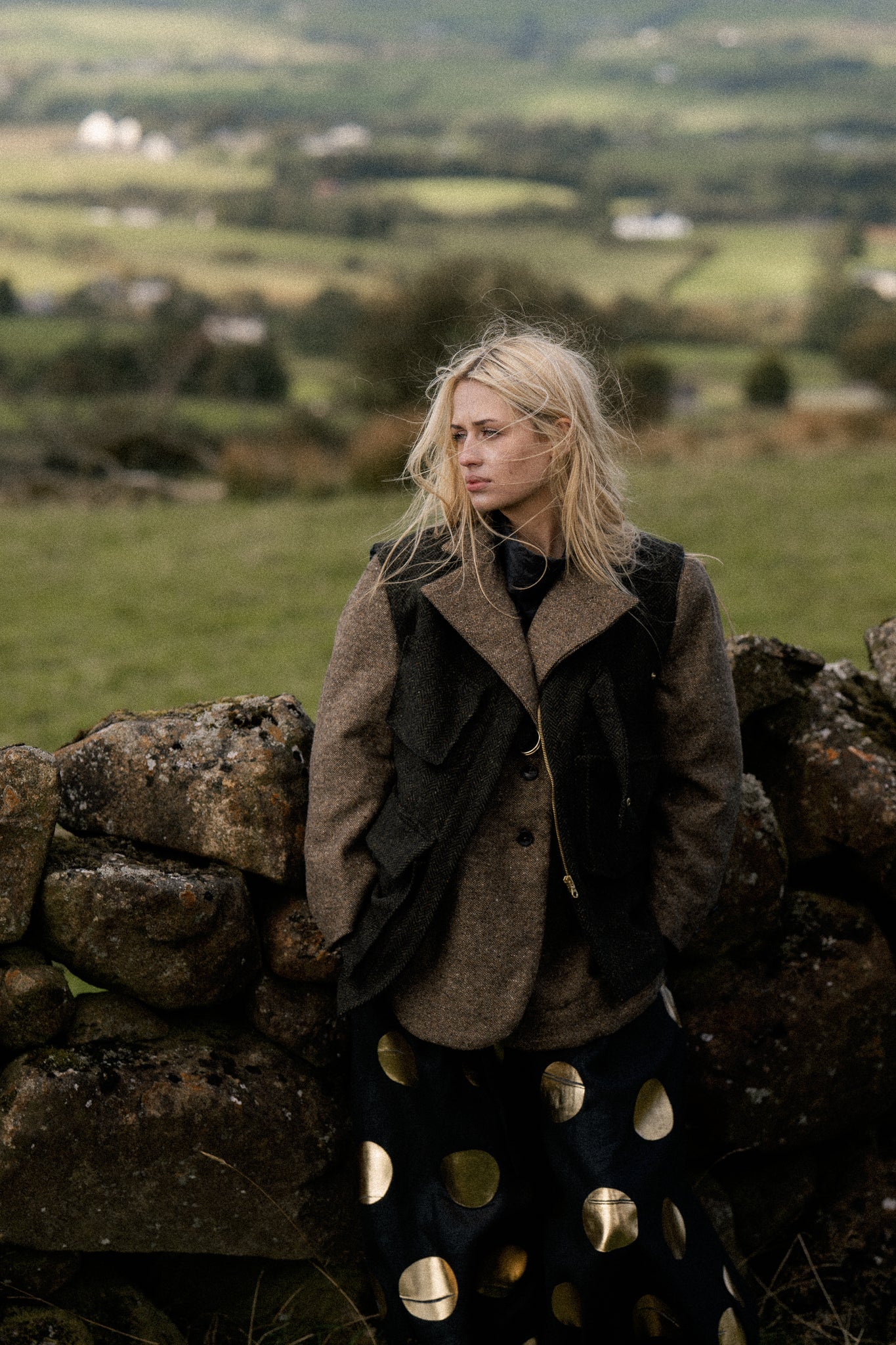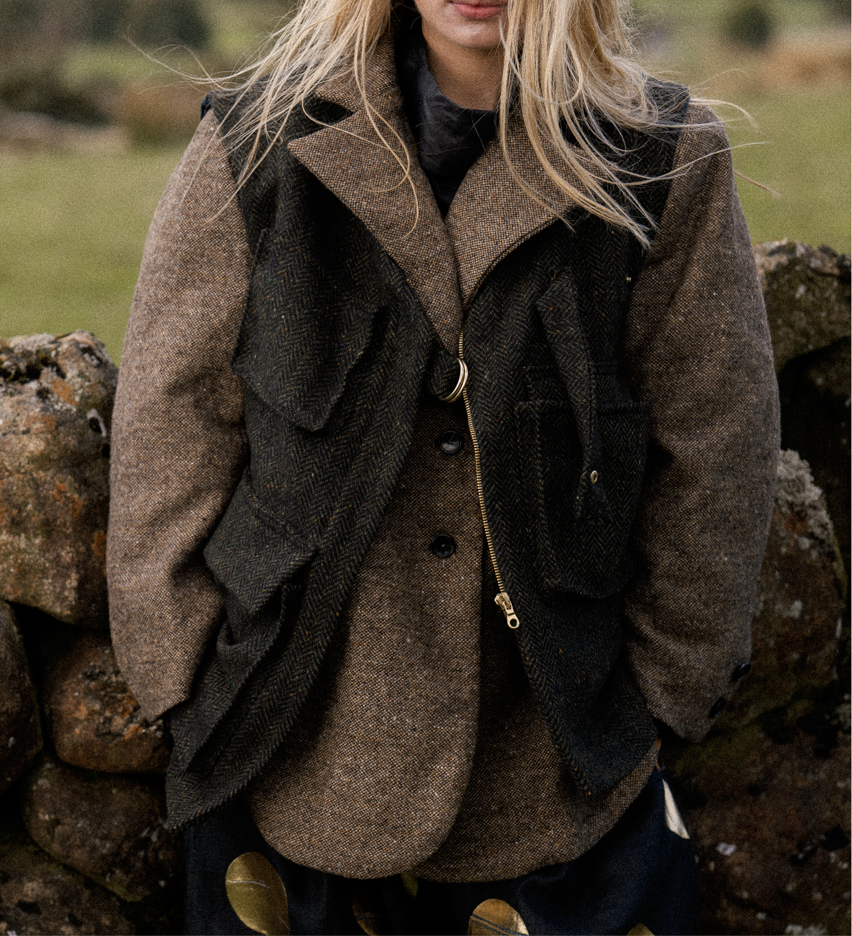 Introducing our Asymmetric Tweed Gilet – a modern interpretation of the Irish countryside classic, reimagined with functional utility and sophisticated charm. Crafted from Donegal tweed, it’s designed with practicality in mind, featuring oversized pockets, a gold zipper, and an asymmetric hemline detail. The Donegal tweed outer layer offers durability, while the navy linen lining ensures breathability and comfort, perfect for layering across seasons.
